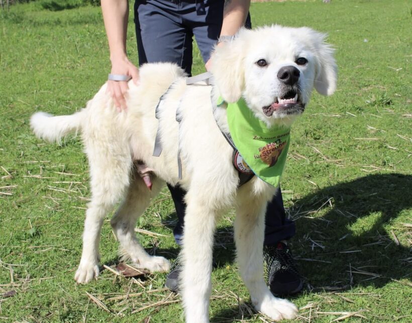 Aktuell ist Alapaka etwa 60 cm groß, wird aber auf jeden Fall noch wachsen. Auch wenn Alpaka zu wenig Gewicht auf den Rippen hat, unter den Rippen hat er ein Herz, was förmlich vor Liebe überquillt. Er liebt Menschen und seine Artgenossen. Ob das auch für Katzen gilt, wissen wir nicht. Alpaka zeigt welpentypisches, altersgerechtes Verhalten. Außerdem kann er von Streicheleinheiten einfach nicht genug bekommen. Leider können unsere Helfer:innen vor Ort diesem Bedürfnis nicht immer nachkommen.