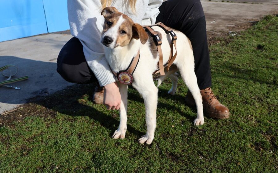 Anda ist etwa 4 Monate alt und wird vermutlich mittelgroß, wenn sie ausgewachsen ist. Ihr überwiegend helles Fell wird besonders im Gesicht von zarten braunen Akzenten geziert. Die braunen Augen strahlen Neugier und Freundlichkeit aus, und die schwarze Nase setzt einen klaren Kontrast in ihrem hübschen Gesicht. Mit ihrer schlanken, beweglichen Statur wirkt sie verspielt, aufmerksam und elegant zugleich.