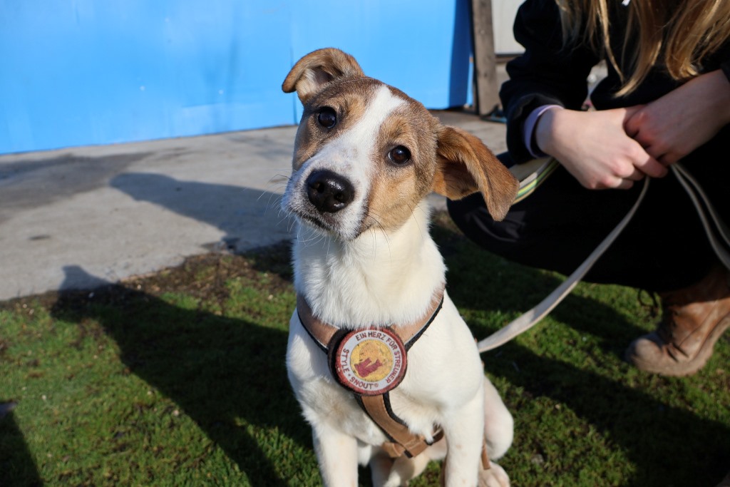 Anda ist etwa 4 Monate alt und wird vermutlich mittelgroß, wenn sie ausgewachsen ist. Ihr überwiegend helles Fell wird besonders im Gesicht von zarten braunen Akzenten geziert. Die braunen Augen strahlen Neugier und Freundlichkeit aus, und die schwarze Nase setzt einen klaren Kontrast in ihrem hübschen Gesicht. Mit ihrer schlanken, beweglichen Statur wirkt sie verspielt, aufmerksam und elegant zugleich.