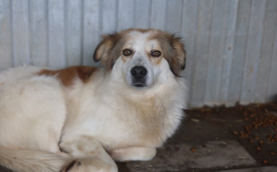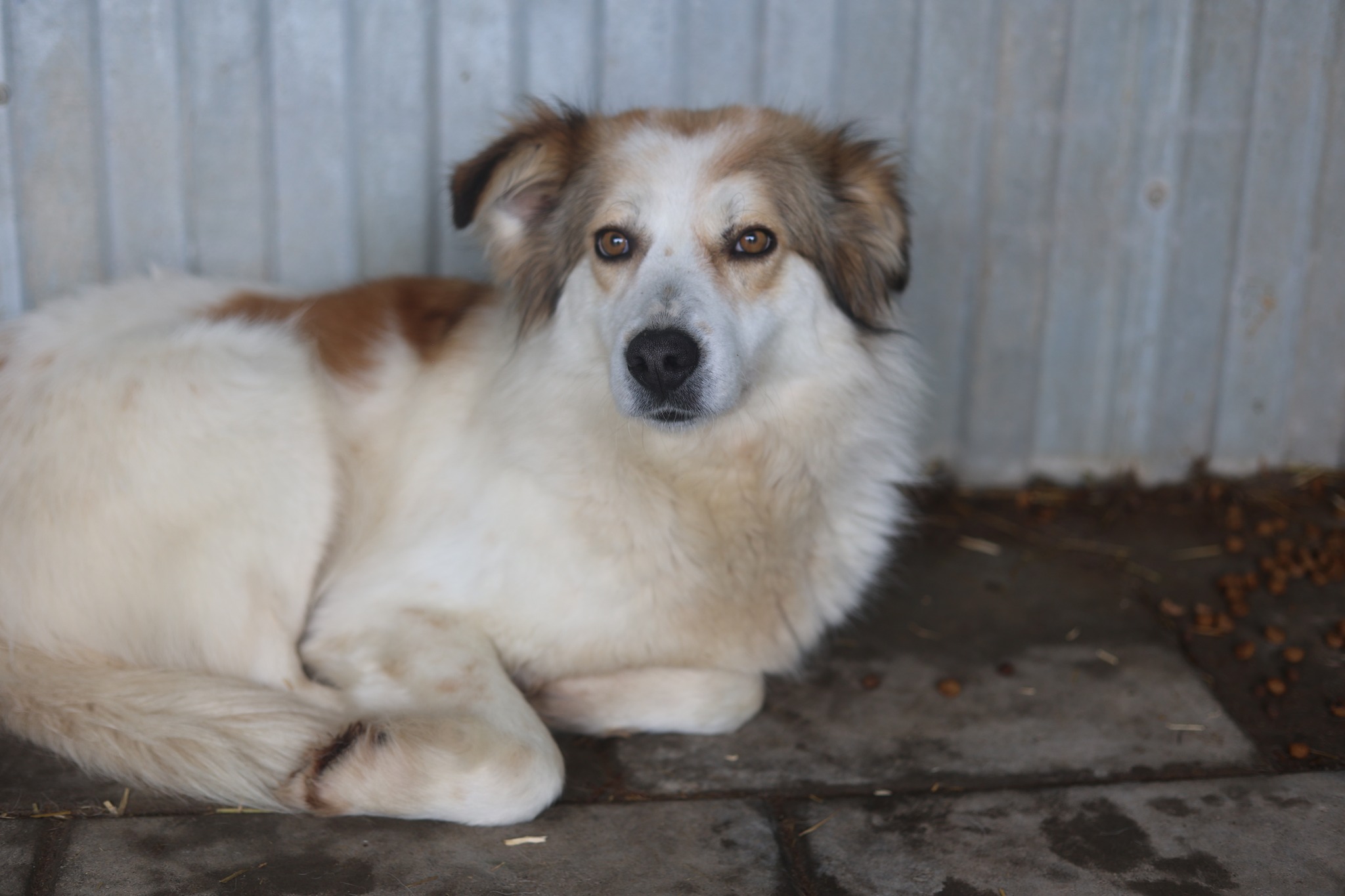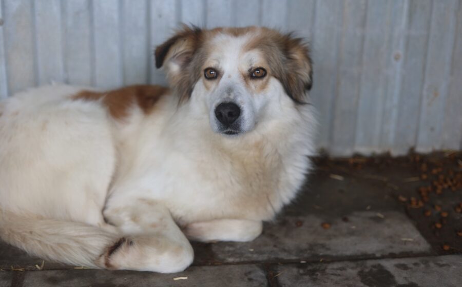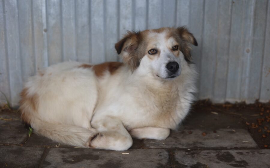 Wir schätzen ihre Schulterhöhe auf rund 50 cm bei einem Gewicht von etwa 20 kg. Ihr Alter ist ihr kaum anzusehen: Ihr längeres, weiches Fell ist überwiegend weiß und von warmen Brauntönen durchzogen, die ihr ein besonders sanftes und edles Aussehen verleihen.