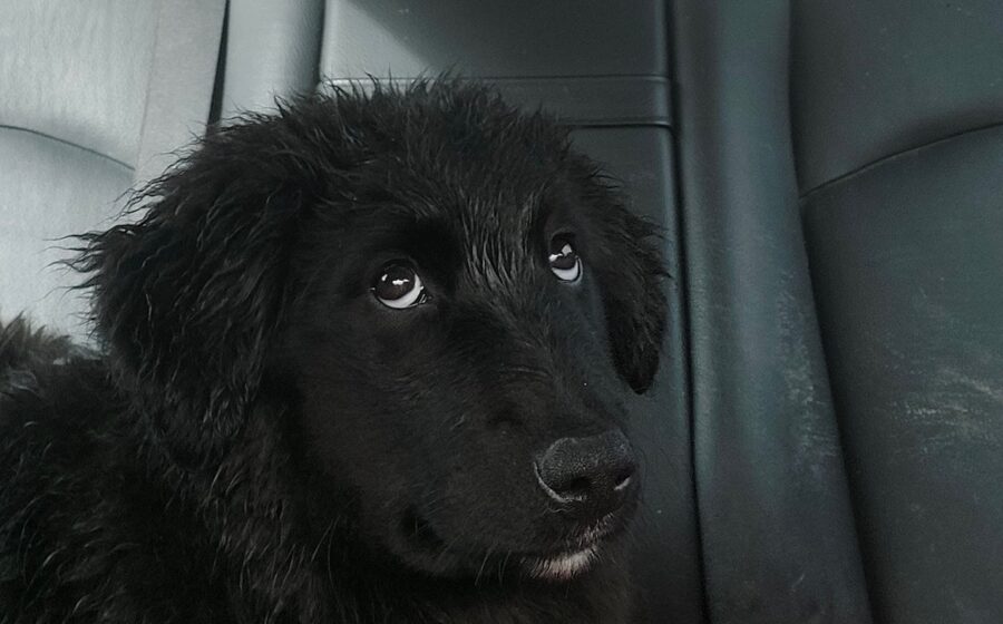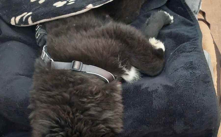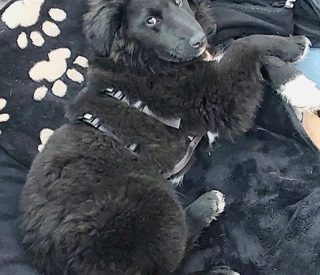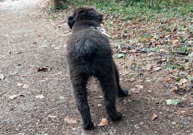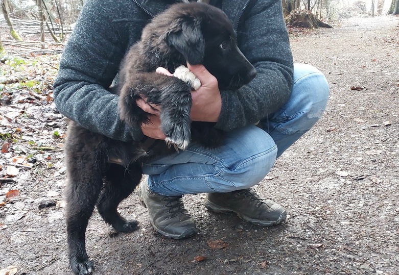 Aktuell sieht Baxter aus wie ein kleiner Schwarzbär, der weiße Söckchen trägt. Baxter hat eine wahrscheinlich angeborene verkürzte Rute und kann deswegen nicht in die Schweiz vermittelt werden.