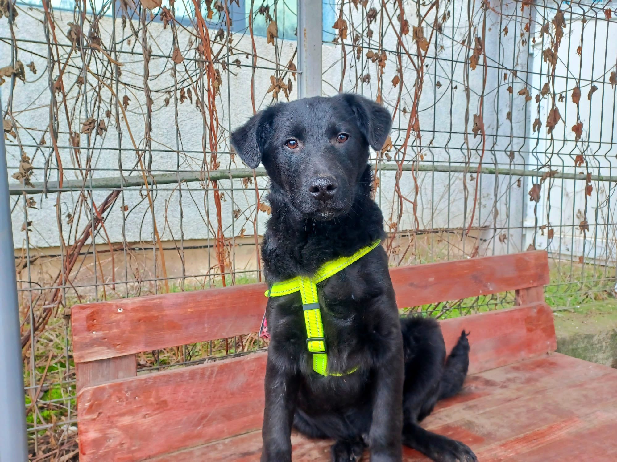 Blackie ist etwa 6 Monate alt und ein echter Blickfang: rabenschwarzes, glänzendes Fell, weiche Schlappohren und wunderschöne braune Augen, die einen direkt ins Herz treffen. Aktuell lebt er im Shelter Zalau in einem Außenzwinger – ein Ort, der für einen jungen Hund wie ihn viel zu laut, zu kalt und zu reizarm ist.