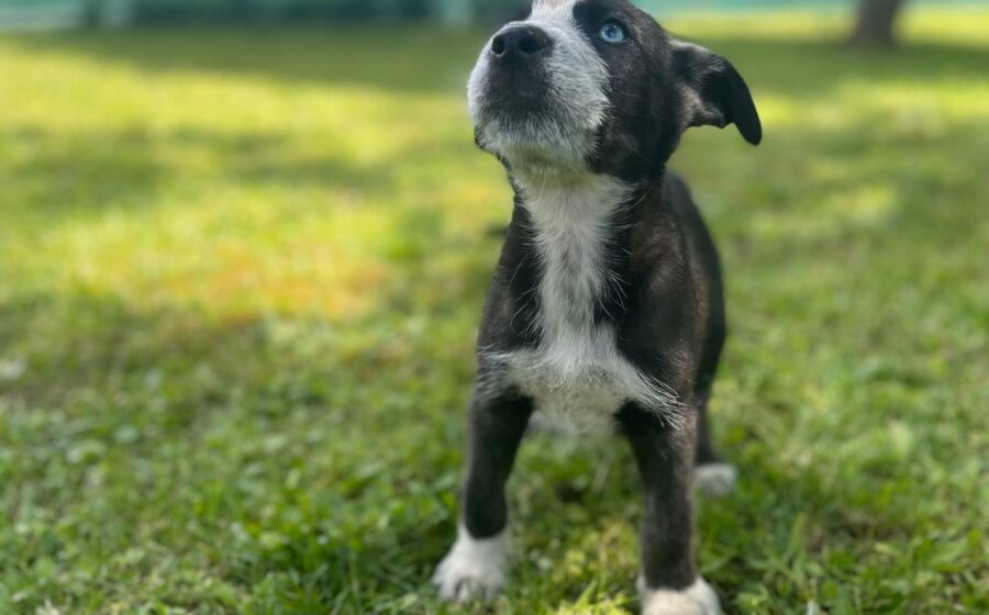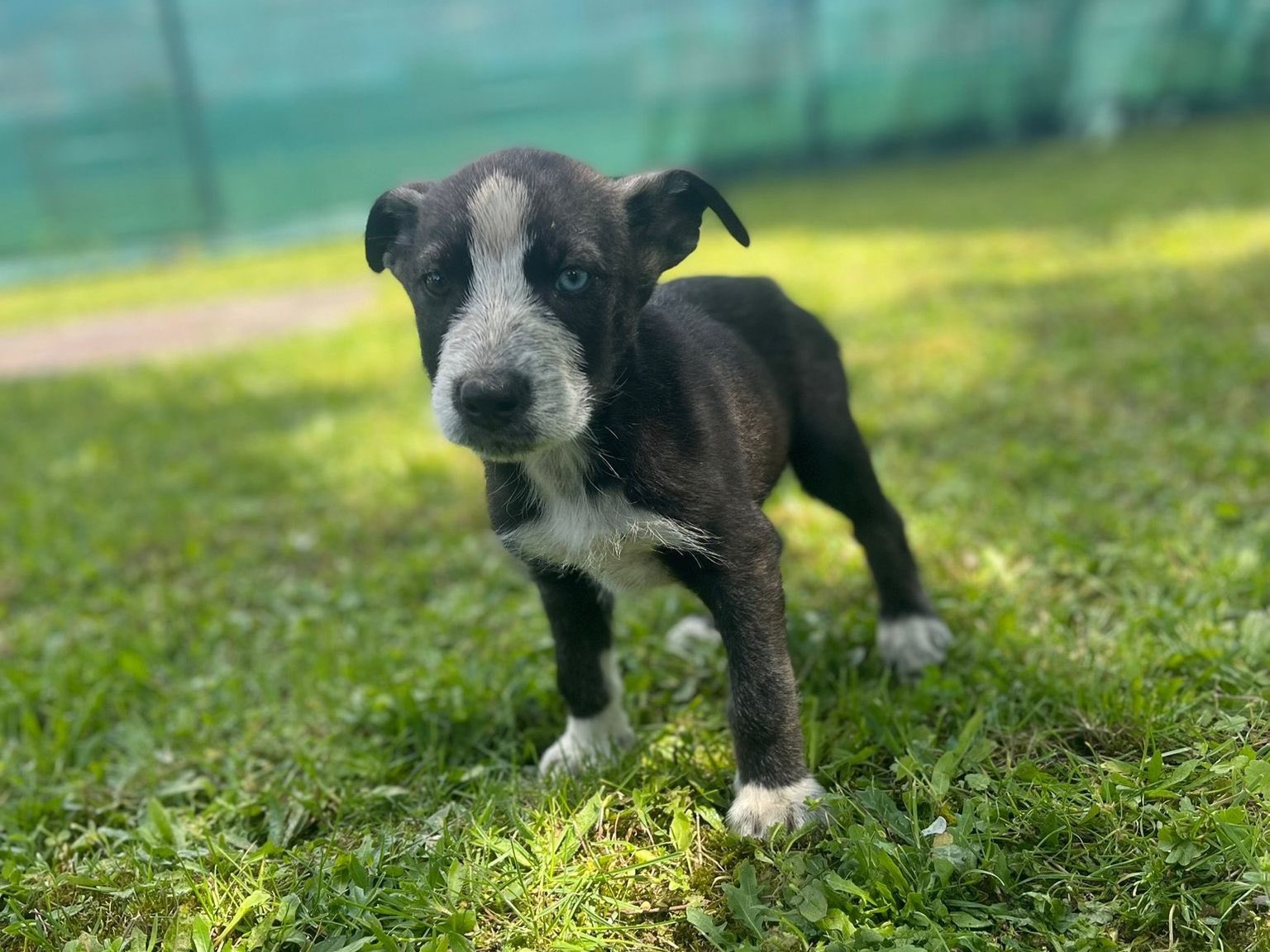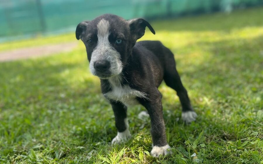 Der kleine Blinky hat kurzes, schwarz-braunes Fell mit weißen Abzeichen im hübschen Gesichtchen, an der Brust und den Pfötchen und einen ganz bezaubernden und auffälligen Augenaufschlag, denn aus einem braunen und einem blauen Kullerauge guckt er hoffnungsvoll in seine Zukunft. Der kleine Welpe ist erst zwei Monate alt und wird sich voraussichtlich zu einem sportlichen und eleganten, mittelgroßen Hund entwickeln.