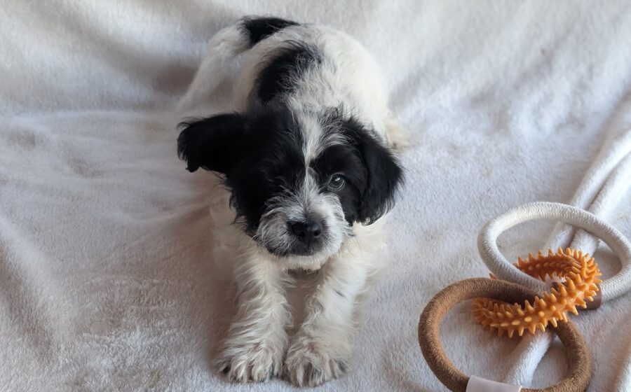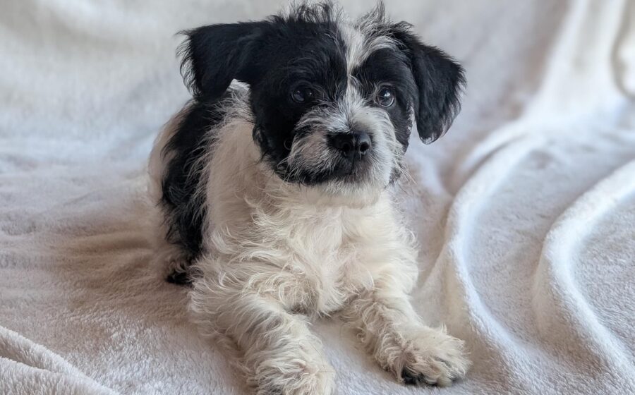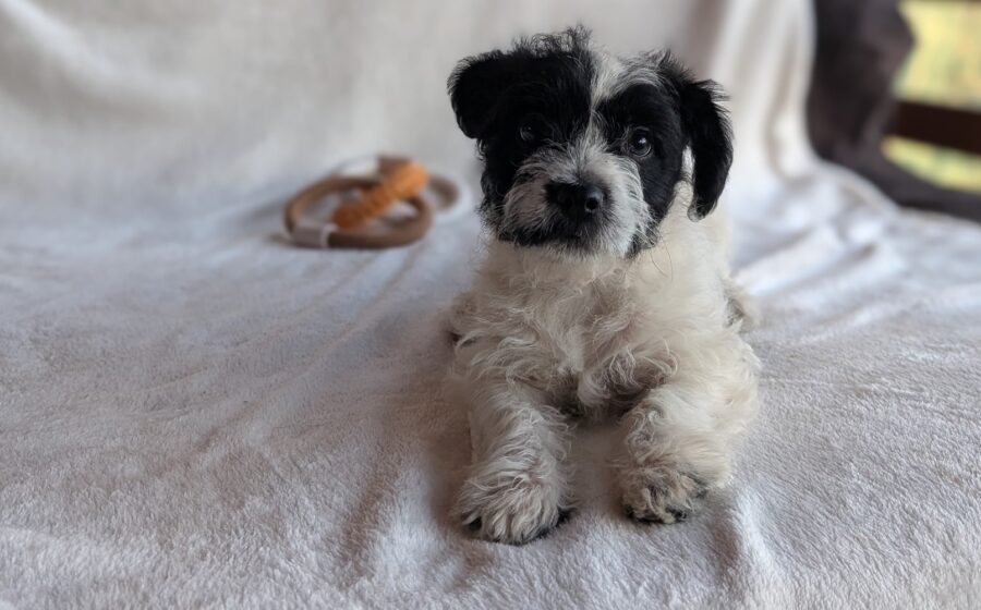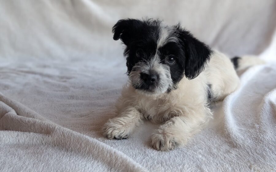 Die kleine Hündin hat weiches, schwarz-weißes Fell, eine glänzende, schwarze Nase und ein zuckersüßes Gesichtchen. Mit ernsten, schwarzen Augen schaut sie in die Kamera. Die süße Bluebelle wird voraussichtlich ihre kleine Größe behalten und passt so in jede tierliebe Familie.