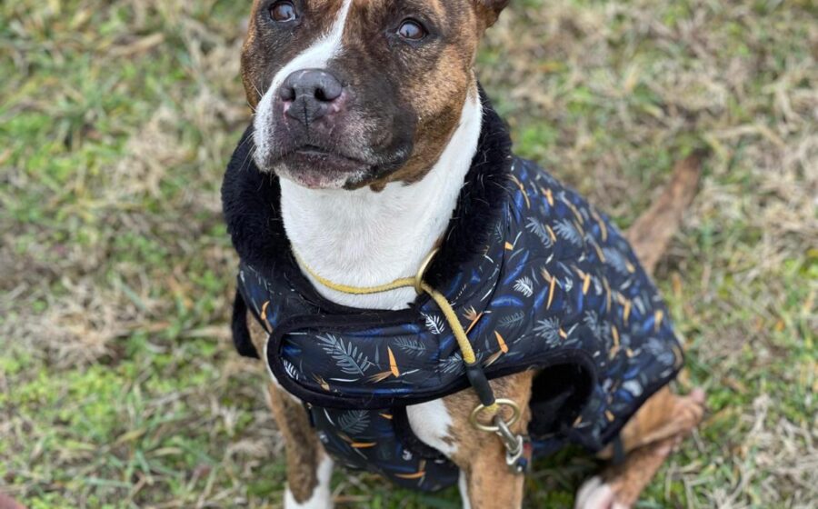 Brindilla hat kurzes, gestromtes Fell mit einer weißen Brust und weißen Pfotenspitzen. Sie ist ca. 40 cm groß, hat eine kräftige, muskulöse Figur und eine schmale, weiße Blesse im hübschen Gesicht. Nicht nur echte Staffi-Fans werden gleich erkennen, dass es sich bei ihr um ein besonders schönes Exemplar dieser Rasse handelt.