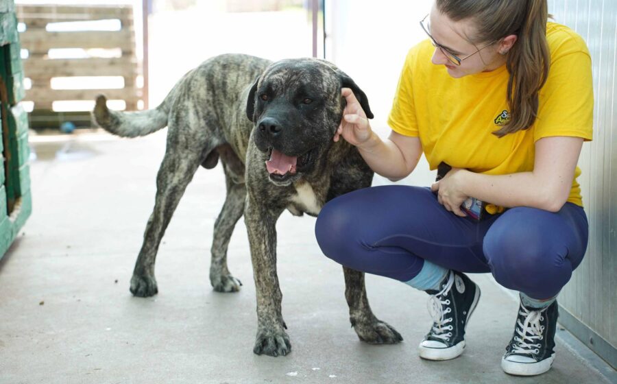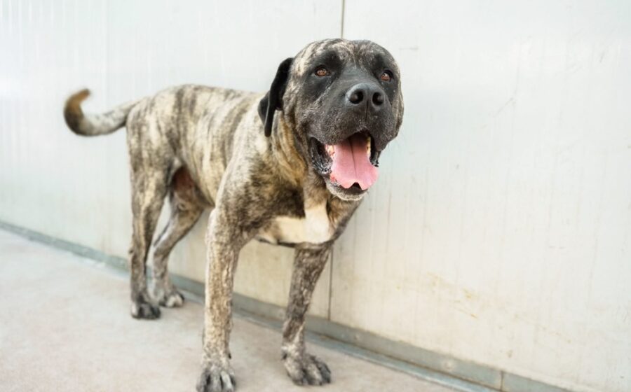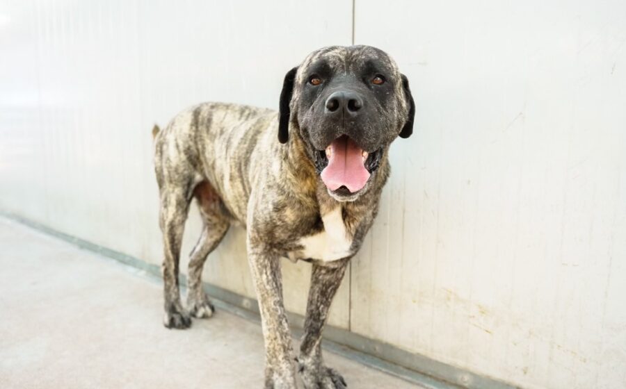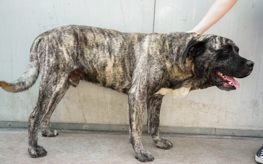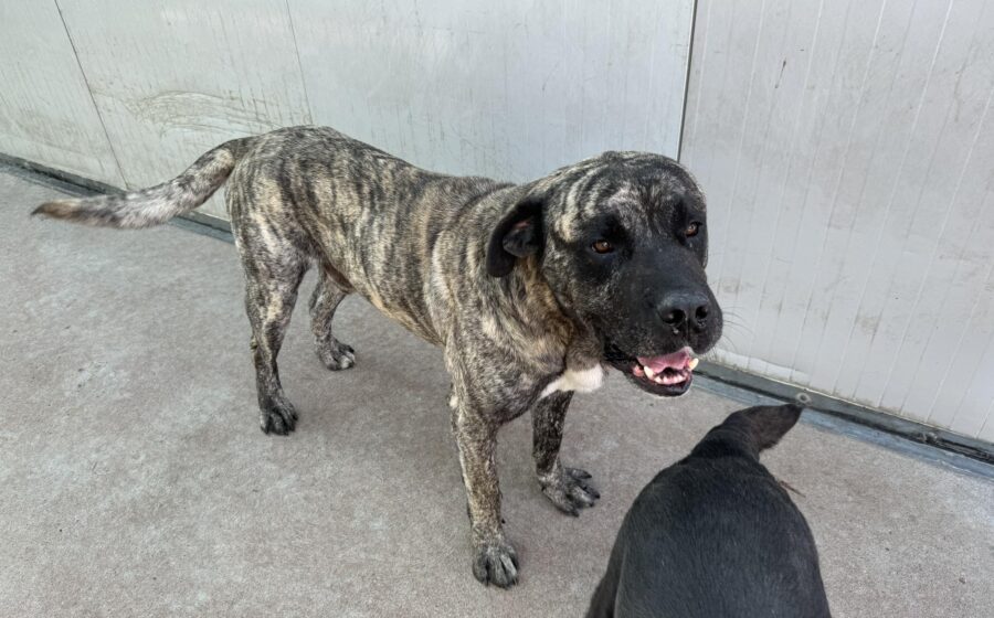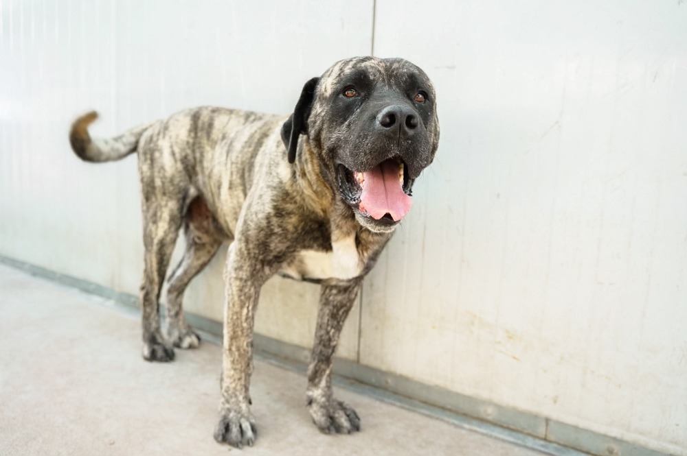 Mit einer Schulterhöhe von ca. 65 cm ist Buddie ein großer und kräftiger Hund. Er hat gestromtes Fell und eine muskulöse Figur. Seine Farbe, seine Statur und sein prägnantes Gesicht legen die Vermutung nahe, dass es sich bei Buddie um einen Cane Corso-Mix handelt. Wir hoffen sehr, dass für den wunderschönen Hund bald ein neues, besseres Leben beginnen kann, damit sein liebenswertes Wesen durch das stressige und triste Zwingerleben keinen Schaden nimmt. Wir drücken die Daumen, dass er bald in eine geeignete End- oder Pflegestelle reisen kann.