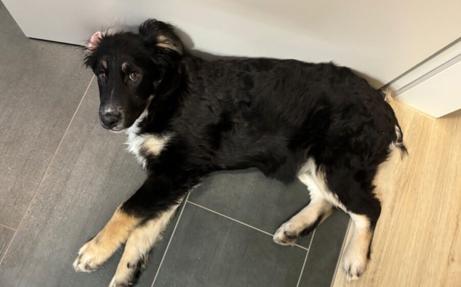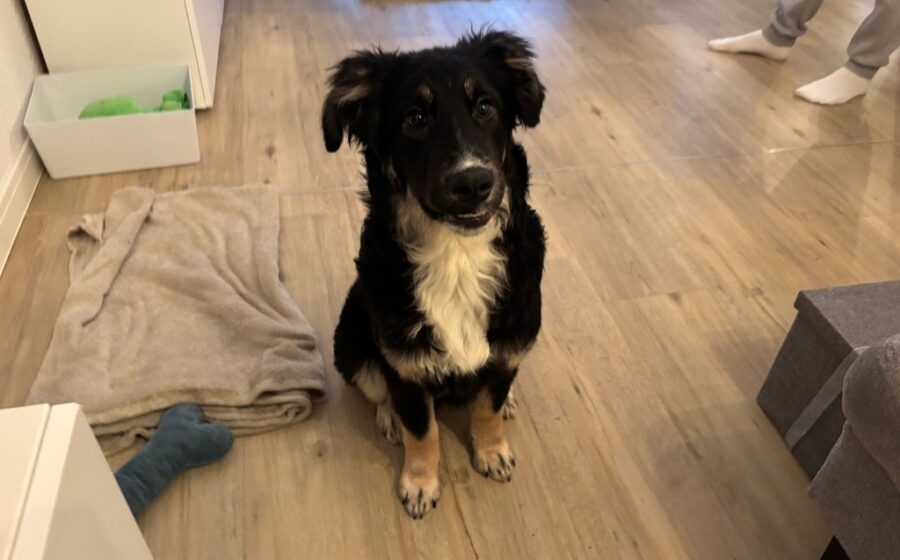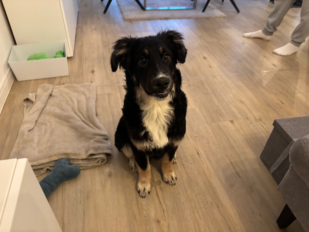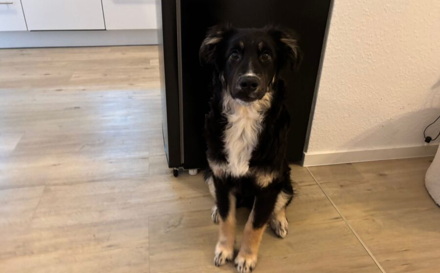 Die junge Hündin ist inzwischen etwa 6 Monate alt und misst ca. 45–50 cm Schulterhöhe. Optisch erinnert sie an einen Hütehund-Mischling – mit ihrem harmonischen Körperbau, dem aufmerksamen Blick und ihrem klugen Ausdruck bringt sie vieles mit, was man sich von einem solchen Mix wünscht.