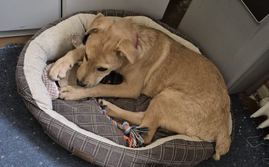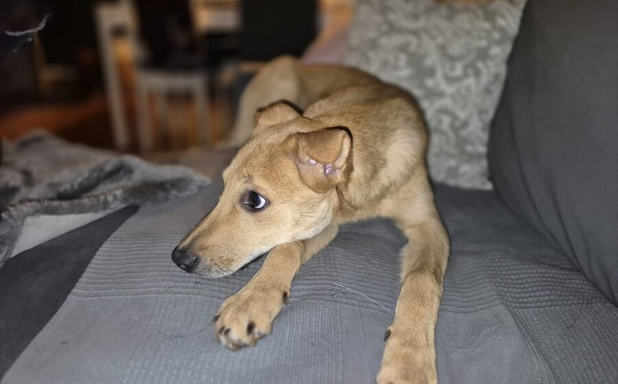 Carolin ist inzwischen in ihrer Pflegestelle angekommen und macht dort jeden Tag kleine Fortschritte. Sie ist etwa 4 Monate alt, freundlich, neugierig, aufgeschlossen – einfach ein typischer Welpe, der die Welt entdecken möchte und dabei jeden Tag mutiger wird. Ihre Demodex-Hautprobleme sind vollständig abgeheilt, und sie kann ihr neues Leben nun unbeschwert beginnen.