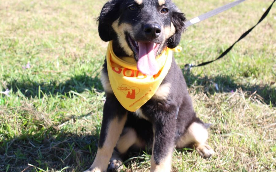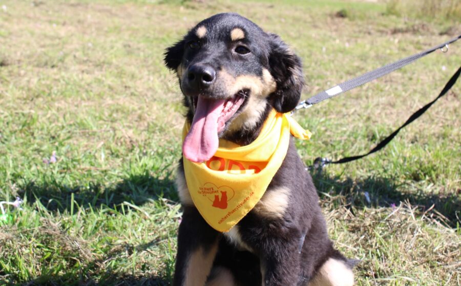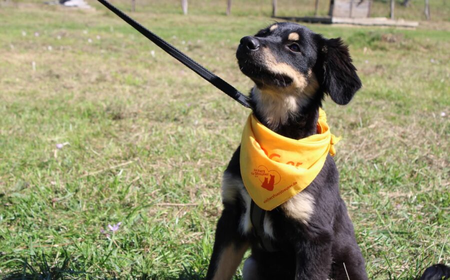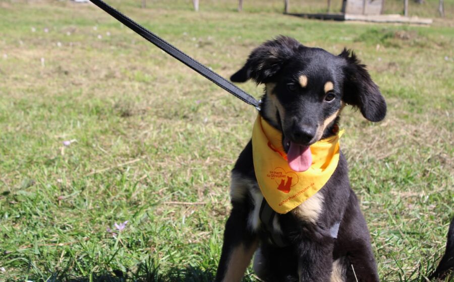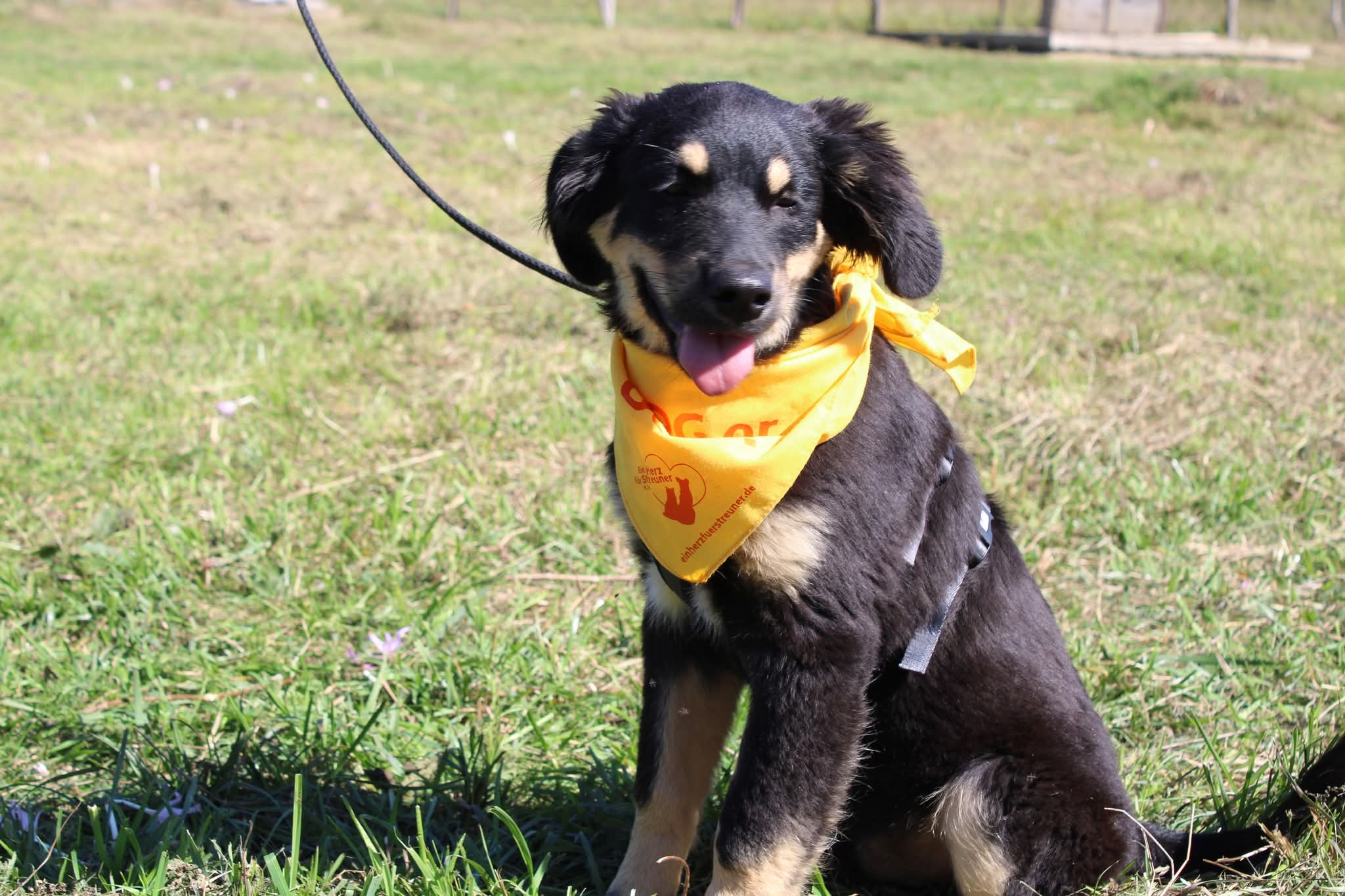 Optisch ist Charleston ein echter Hingucker: Seine treuen, dunklen Augen lassen Herzen höherschlagen. Besonders charmant wirkt er mit den süßen Schlappohren und den verspielten Halstüchern, die er mit Stolz trägt. Noch ist er etwa 37 cm groß und wird ausgewachsen etwa mittelgroß werden – seine Mutter hat eine Schulterhöhe von 40 cm. Wir können nicht ausschließen, dass in Charleston ein Mix Hütehund steckt. Die Mutter ist vermutlich ein Hütehund-Mix.