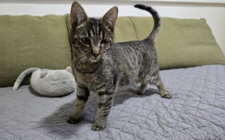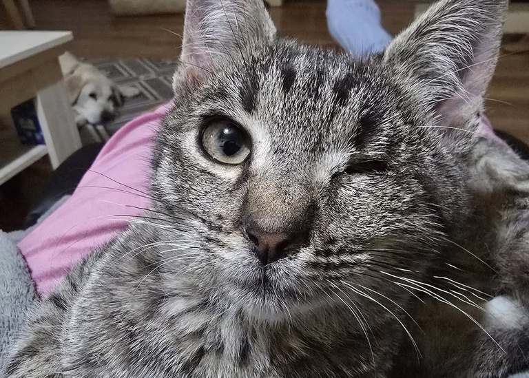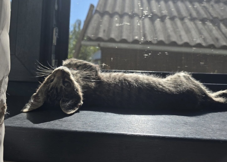 Clyde hatte keinen leichten Start ins Leben. Er wurde in einem sogenannten „Hoarder-Haushalt“ gefunden, in schlechtem gesundheitlichem Zustand mit mehreren Infektionen. Durch das Herpesvirus verlor er sein linkes Auge. Dank intensiver Behandlung ist er heute gesund, stabil und voller Tatendrang. Sein Handicap beeinträchtigt ihn im Alltag nicht – er bewegt sich sicher und spielt wie jede andere junge Katze.