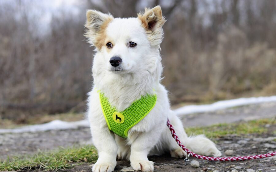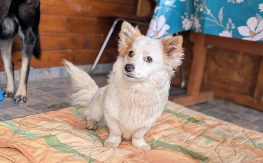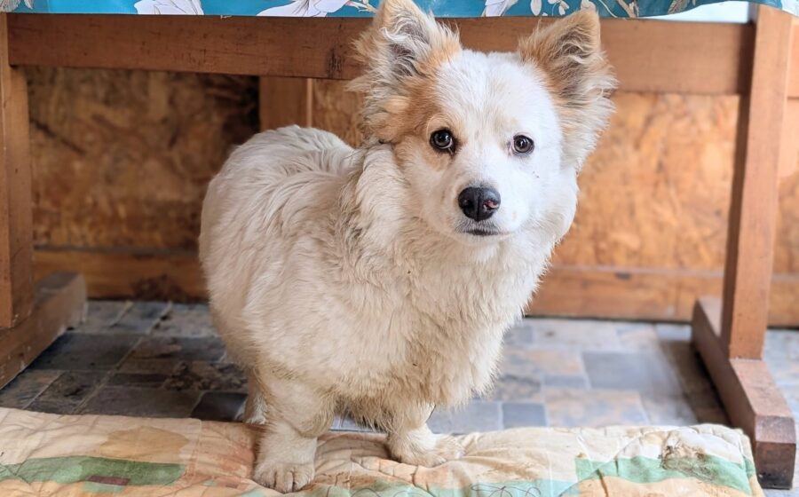 Corgnelius ist ein kleiner Rüde, etwa 1 Jahr alt, mit einer Schulterhöhe von ca. 35 cm und rund 12 kg Körpergewicht. Sein weißes Fell wird von hellbraunen Akzenten am Köpfchen geschmückt, dazu warme braune Augen und eine lackschwarze Nase. Sein Gesicht ist einfach zum Verlieben – superniedlich, aufmerksam, sanft. Besonders goldig sind seine kurzen Beinchen, die ihm einen ganz eigenen Charme verleihen.