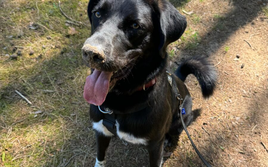 Dante ist ein etwa 2 Jahre alter, rund 65 cm großer Rüde mit dunklem, glänzendem Fell und auffälligen weißen „Socken“. Er ist ein bildschöner, charakterstarker Hund – kräftig, intelligent und aufmerksam zugleich.