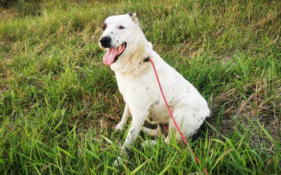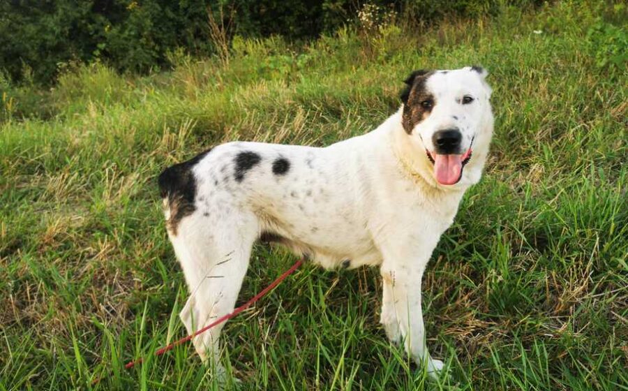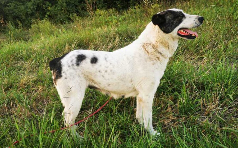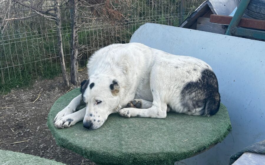 Die mit etwa 66 cm und 35 kg stattliche Hündin und ihrem weißen Fell und der schwarzen Augenklappe wirkt trotz ihrer Vergangenheit freundlich und neugierig. Anfangs etwas zurückhaltend, öffnet sie sich Schritt für Schritt und genießt Streicheleinheiten. Mit anderen Hunden ist sie verträglich, Katzen kennt sie bisher nicht. Ihr Alter wird auf etwa 5 Jahre geschätzt.