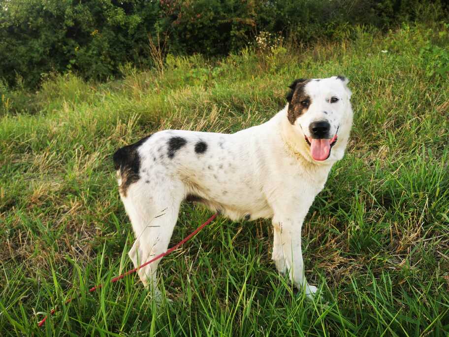 Die mit etwa 66 cm und 35 kg stattliche Hündin und ihrem weißen Fell und der schwarzen Augenklappe wirkt trotz ihrer Vergangenheit freundlich und neugierig. Anfangs etwas zurückhaltend, öffnet sie sich Schritt für Schritt und genießt Streicheleinheiten. Mit anderen Hunden ist sie verträglich, Katzen kennt sie bisher nicht. Ihr Alter wird auf etwa 5 Jahre geschätzt.