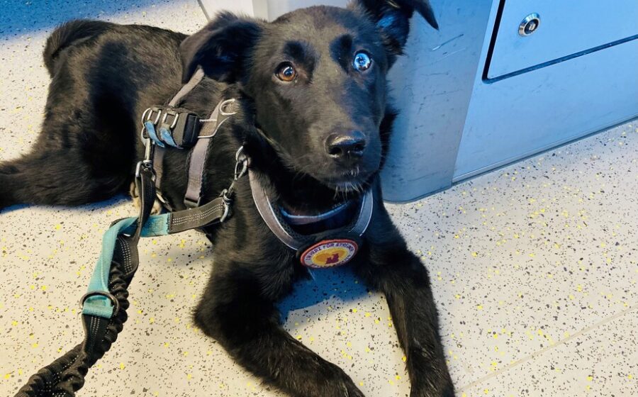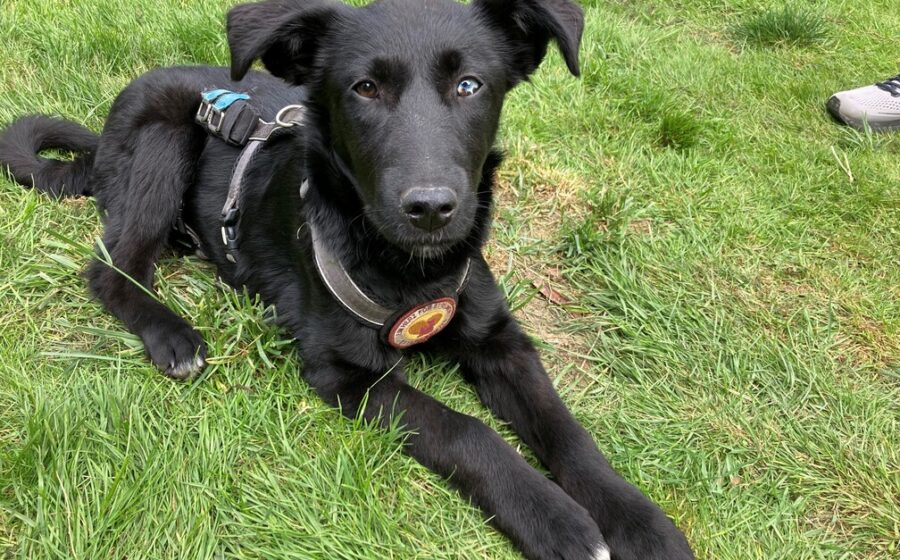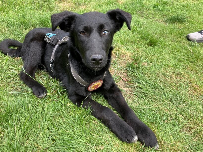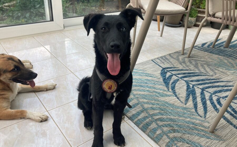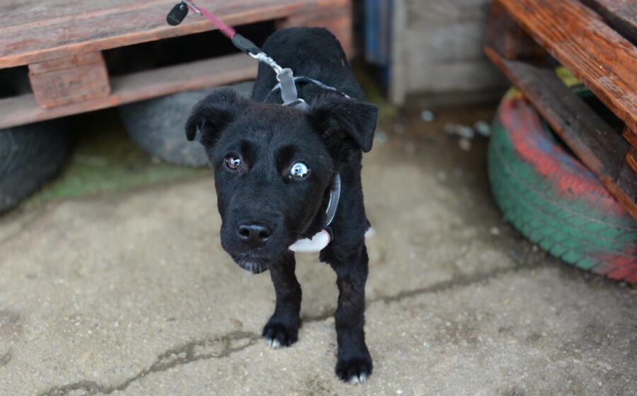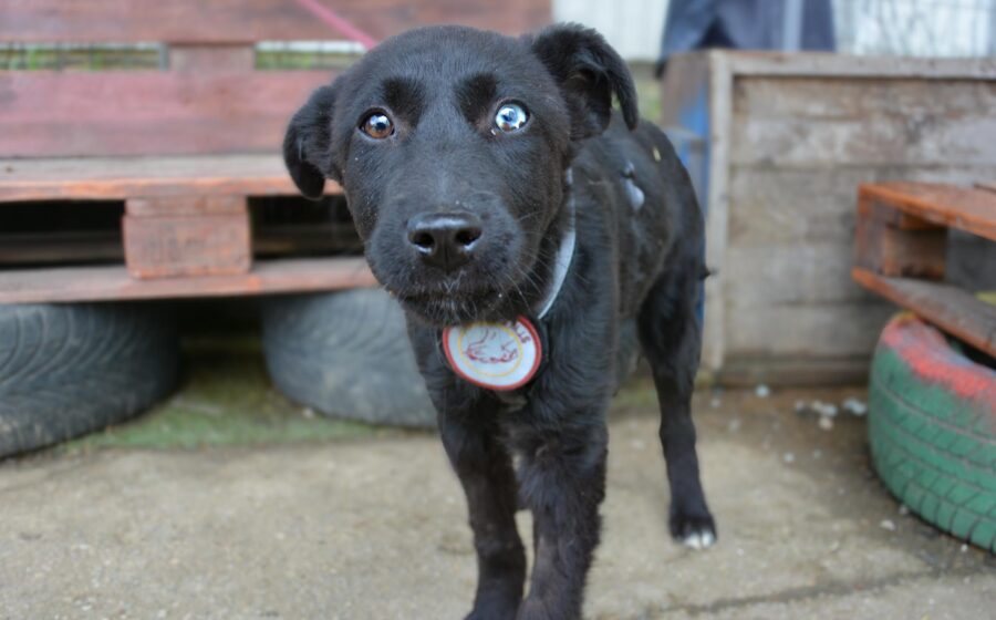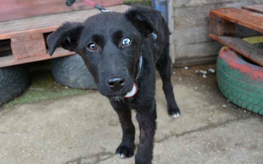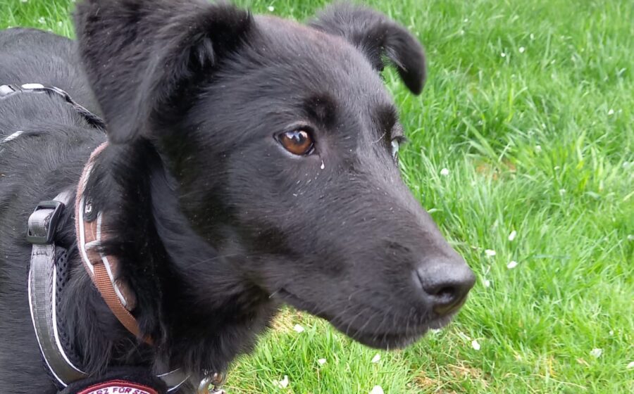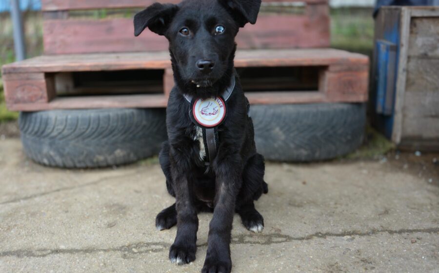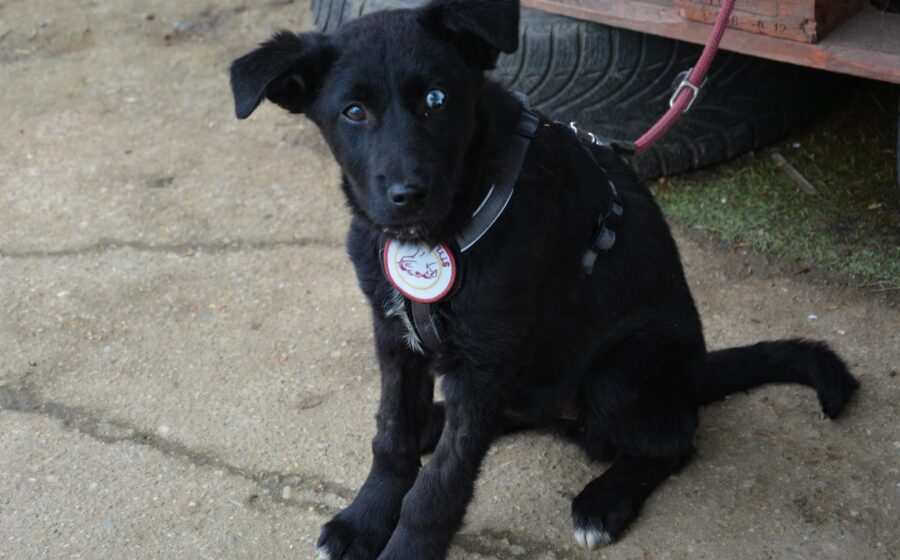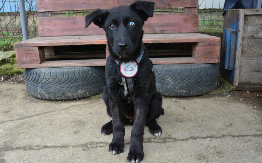 Delphi mit dem faszinierenden eisblauen Auge, dem glänzenden, leicht längeren schwarzen Fell und der kleinen weißen Stelle an der Brust ist ein sehr freundliches, aktives und sehr verspieltes Hundekind. Sie geht offen auf alle Menschen und auch gern auf Kinder zu und lässt sich gerne ausgiebig streicheln, ist aber dabei nicht aufdringlich. Delphi liebt es, in der Nähe von Menschen zu sein.