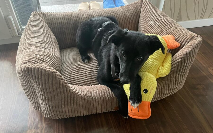 Dina, eine dunkle Schönheit in edler schwarzer Optik möchte endlich ankommen. Das junge, zarte Hundemädchen ist wunderschön – sie besticht mit ihrem schwarzen, seidigen Fell, den weißen Pfötchen und den neugierigen Knopfaugen, die neugierig fragen: „Spielst du mit mir?“