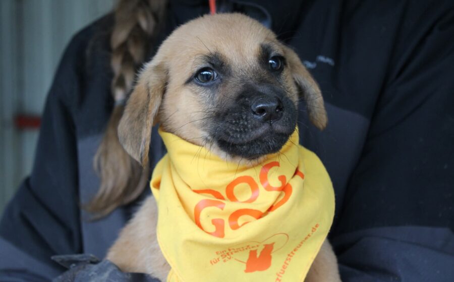 Drops ist bei der kleinen Welpenbande der Hahn – oder besser: das Hähnchen – im Korb. Er schaut aus seinen grünbraunen Kulleraugen wach und neugierig durch die Gitterstäbe des Zwingers und freut sich unbändig über jede menschliche Aufmerksamkeit. Der Kleine ist Menschen gegenüber offen und geht sofort in Interaktion mit ihnen, sobald er sie sieht.