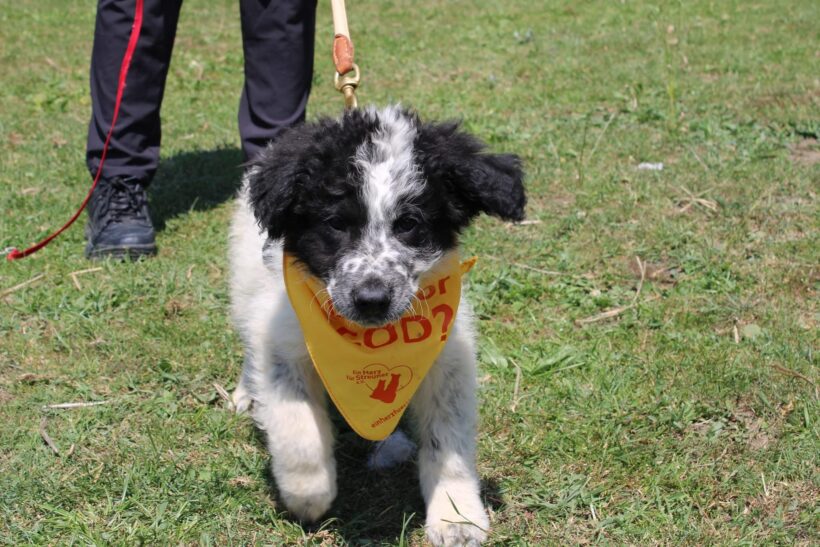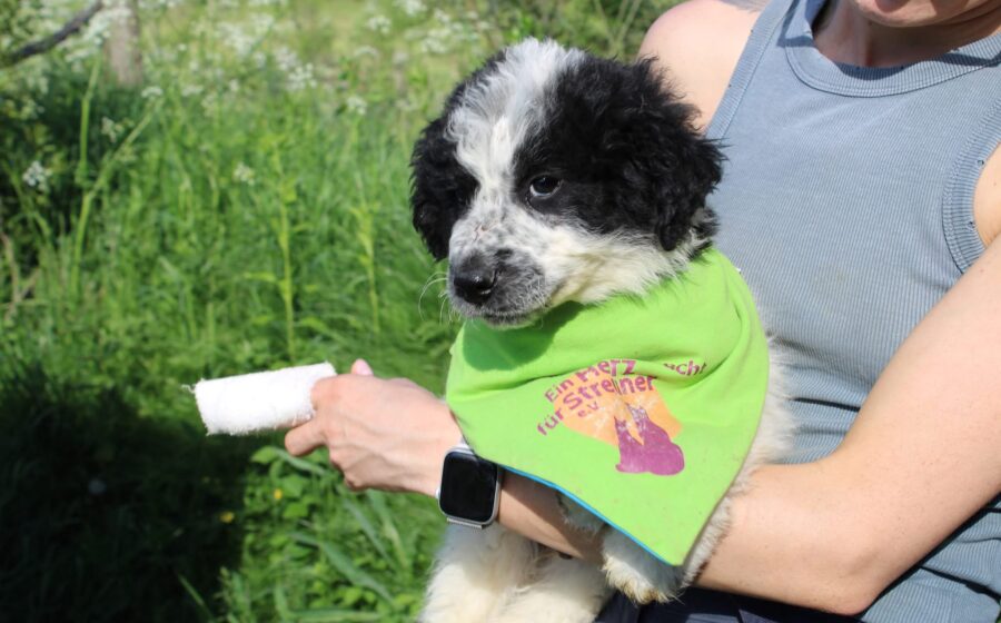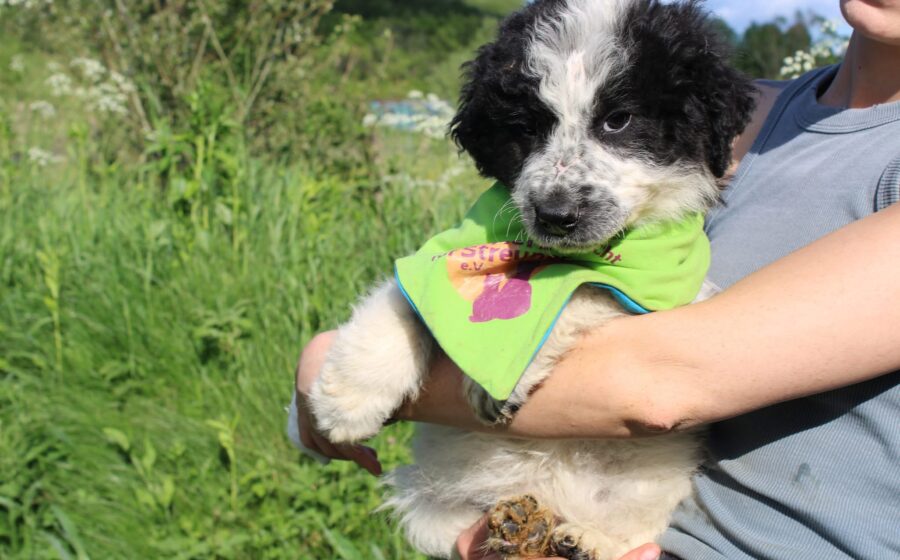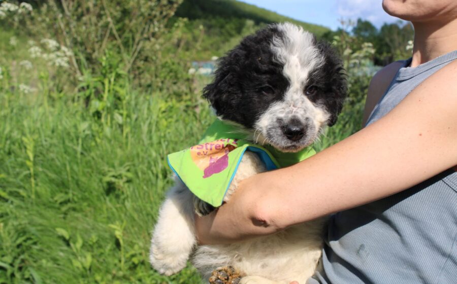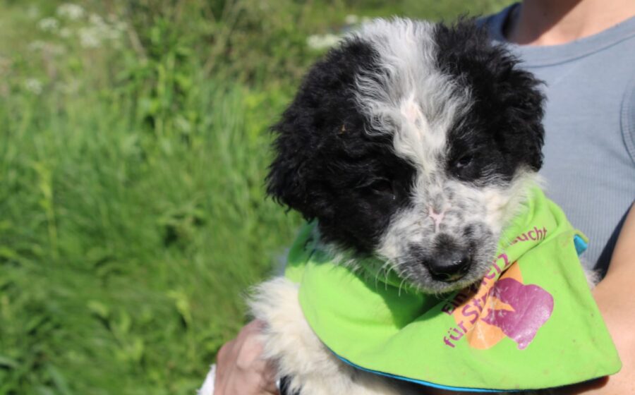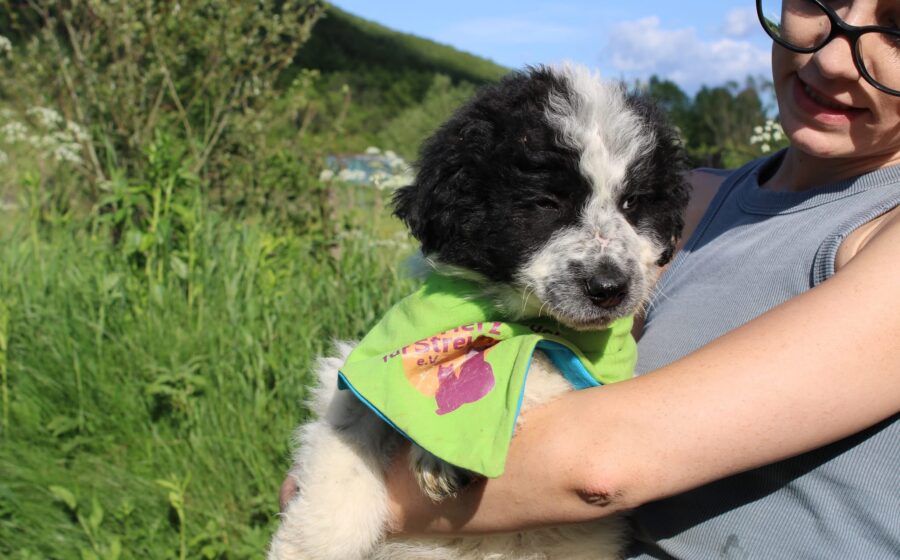 Seine Geschichte beginnt leider an einem sehr traurigen Ort: Ducky wurde gemeinsam mit seinen Geschwistern und seiner Mutter von Tierschützern aus einem verlassenen Schafstall in Rumänien gerettet – einem Ort voller Elend und Leid. Viele Hunde dort waren verletzt oder krank und Ducky hat leider eine verkürzte Rute davongetragen. Aber mit seinem süßen, wuscheligen, schwarz-weißen Fell mit den schwarzen Punkten und den schelmisch funkelnden Augen ist er trotzdem einfach ein wunderschöner kleiner Schatz, der die Herzen im Sturm erobert.