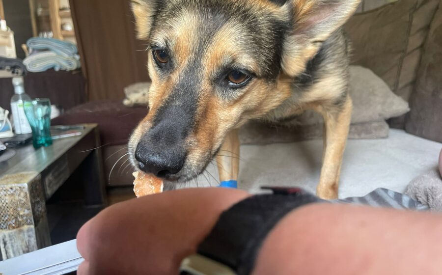 In ihrer Pflegestelle hat sich Eva inzwischen gut in den Alltag integriert. Sie nimmt Leckerlis gern aus der Hand – sogar von Besuchern!, lässt sich vorsichtig streicheln und genießt die sanfte Aufmerksamkeit ihrer Bezugspersonen. Im Haus und Garten bewegt sie sich sicher, kennt ihre Lieblingsplätze, springt fröhlich aufs Sofa, ist stubenrein und kommt, wenn man sie ruft. Ihr Verhalten zeigt deutlich: Eva beginnt, dem Leben zu vertrauen.