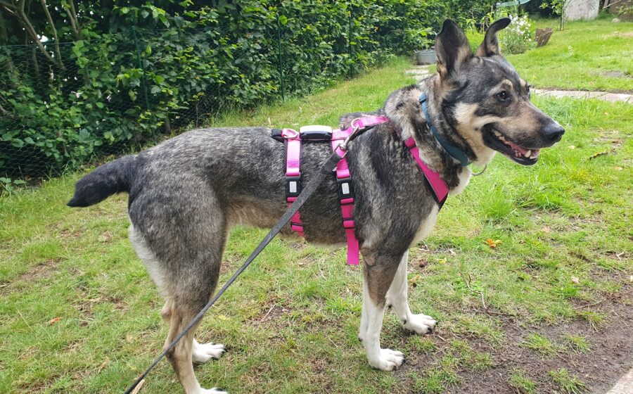 Bei Spaziergängen zeigt sie manchmal noch kleine Unsicherheiten, bleibt stehen, schaut sich die Situation an und geht dann weiter. Leine und Sicherheitsgeschirr sind für Fine kein Problem, als ob sie schon früher damit unterwegs war. Sie geht vorbildlich an der Leine. Mit der vorhandenen Ersthündin im Haushalt versteht sie sich gut, reagiert aber manchmal vorsichtig, wenn diese zu aufgeregt ist. Seit kurzem spielen die beiden auch schon im Garten miteinander, was ihr Vertrauen weiter stärkt.