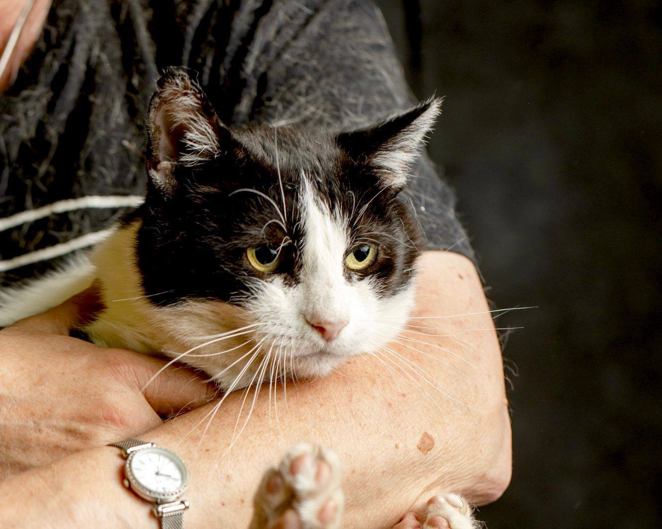 Finley lebte in einem Hof, in dem mehrere Katzen von einem Mann gefüttert wurden. Als er entdeckt wurde, war er in einem schlechten Zustand. Eine tiefe Wunde an seiner Wange benötigte dringend medizinische Versorgung. Er wurde behandelt, versorgt und durfte heilen. Mit jedem Tag wurde er kräftiger und zeigte mehr von seinem sanften, ruhigen Wesen.