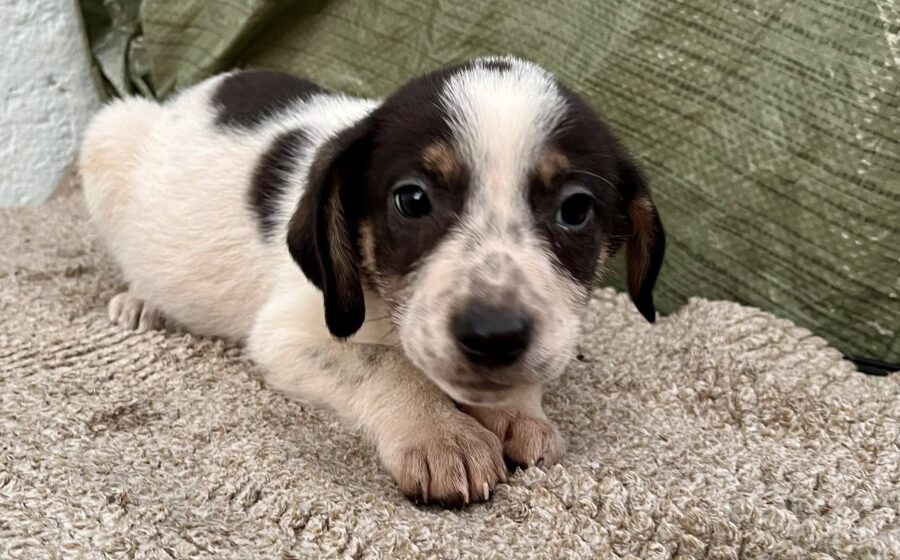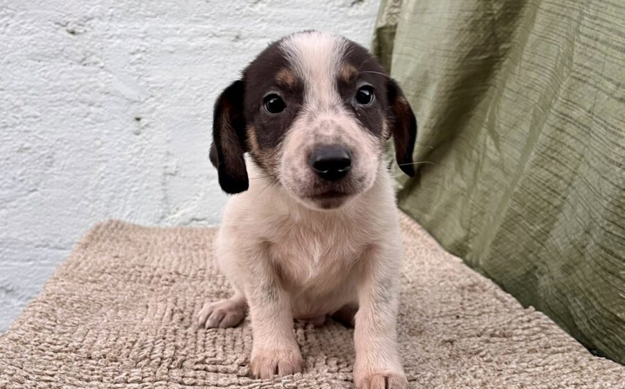 Seine Mutter hat eine Schulterhöhe von etwa 48 cm und wiegt rund 15 kg, daher gehen wir davon aus, dass auch Fips einmal mittelgroß werden wird. Derzeit wiegt er etwa 2 Kg. Vom Aussehen her erinnert er an eine Mischung aus Terrier und Dackel, mit seinem kurzen Beinchen, dem weißen Fell mit schwarzen Flecken und den niedlichen Knopfaugen sowie den süßen Schlappohren.