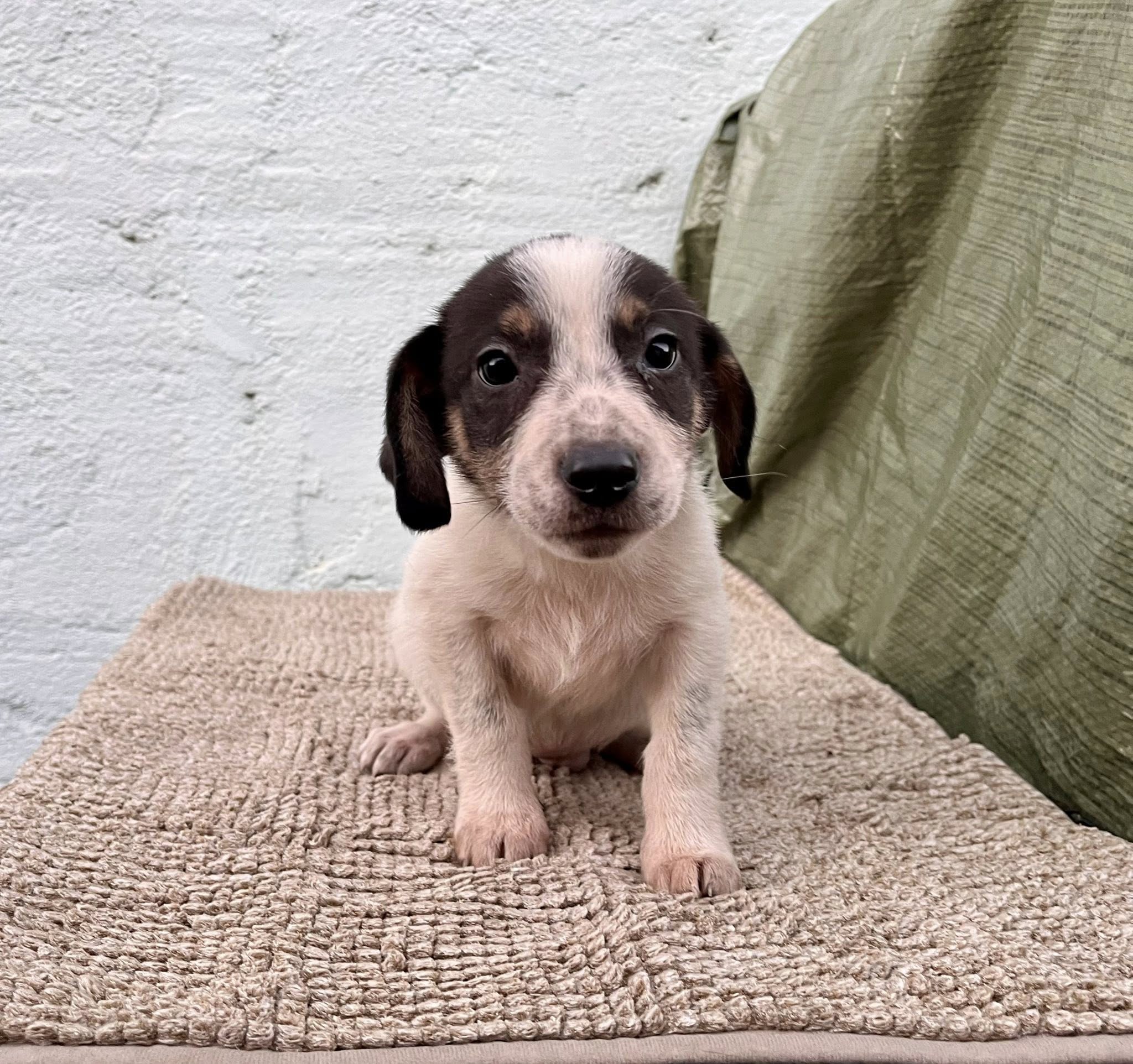 Seine Mutter hat eine Schulterhöhe von etwa 48 cm und wiegt rund 15 kg, daher gehen wir davon aus, dass auch Fips einmal mittelgroß werden wird. Derzeit wiegt er etwa 2 Kg. Vom Aussehen her erinnert er an eine Mischung aus Terrier und Dackel, mit seinem kurzen Beinchen, dem weißen Fell mit schwarzen Flecken und den niedlichen Knopfaugen sowie den süßen Schlappohren.