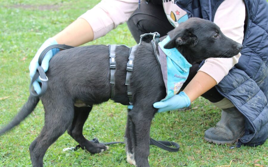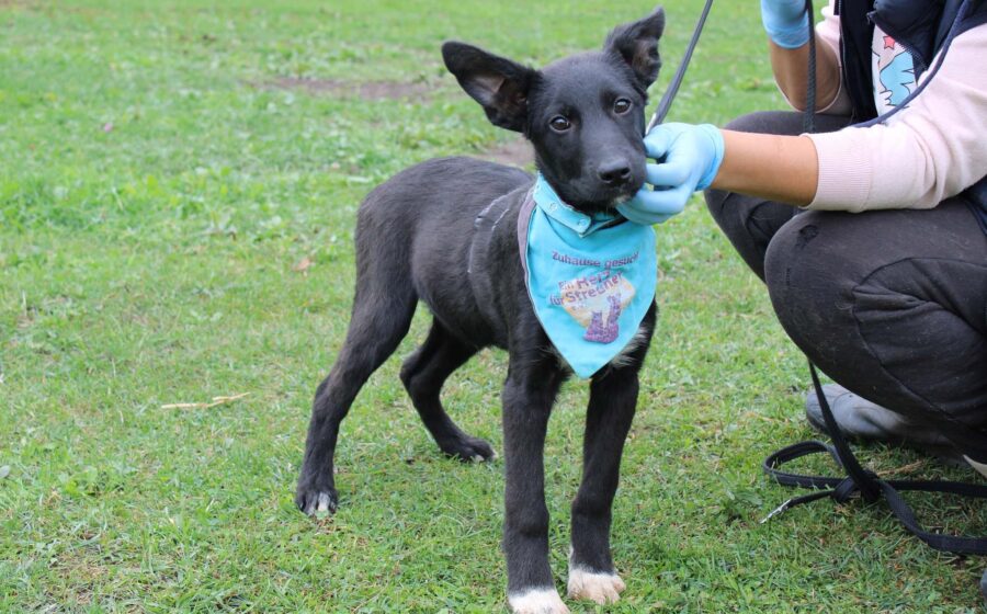 Mit seinen geschätzten 4 Monaten steckt Flap mitten in der süßesten Welpenzeit! Aktuell misst er etwa 37–40 cm und wird vermutlich mal ein mittelgroßer bis großer Rüde – optisch ein potenzieller, toller Hütehund-Mix. Mit anderen Hunden versteht er sich gut, ob das auch für Katzen gilt, wissen wir nicht. Flap und seine Geschwister scheinen keinen leichten Start ins Leben gehabt zu haben. Nun sind sie aber in Sicherheit und warten darauf, gesehen zu werden. Typisch für seinen Start ins Leben zeigt sich Flap zunächst ein wenig schüchtern. Aber wer Geduld hat, wird reich belohnt: Ist das Eis einmal gebrochen, taut er auf und kommt fröhlich zu dir, genießt Streicheleinheiten und liebt es, gehalten zu werden. Er ist dabei ein eher ruhiger Welpenjunge, was vielleicht darauf hindeutet, dass sein bisheriges Leben nicht ganz einfach war. Gerade diese anfängliche Zurückhaltung erfordert in der Welpenzeit besonders viel positive Verstärkung, sanfte Konfrontation mit der Welt und viel Sicherheit durch seine neuen Menschen.