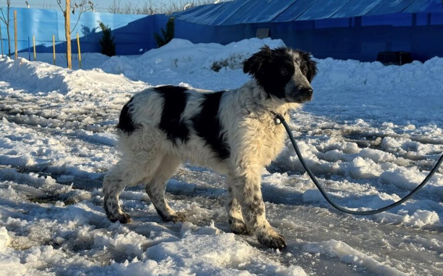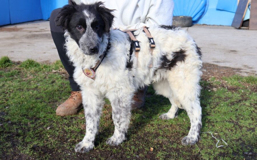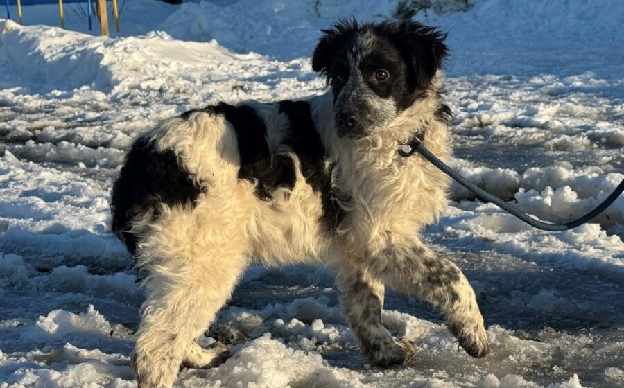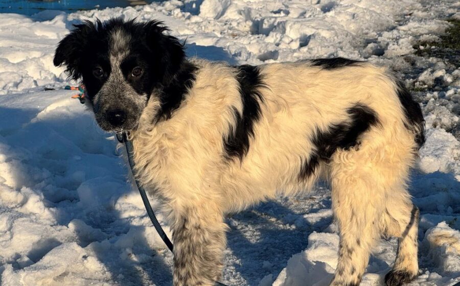 Fraggle ist ein etwa 6 Monate alter Rüde mit einer aktuellen Schulterhöhe von rund 45 cm. Ausgewachsen wird er vermutlich ein mittelgroßer Hund sein. Sein überwiegend weißes Fell wird besonders im Gesicht von schwarzen Akzenten wunderschön eingerahmt. Seine braunen Augen strahlen Aufmerksamkeit und Sanftheit zugleich aus. Die lackschwarze Nase setzt einen markanten Kontrast in seinem wunderschönen Gesicht. Mit seiner schlanken Statur wirkt er elegant und beweglich – wie gemacht dafür, aktiv durchs Leben zu gehen.