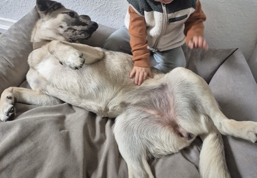 Junghundtypisch ist Frida draußen noch sehr fixiert auf die Nahrungssuche. Hier muss man vorsichtig mit ihr umgehen, da sie auch sämtlichen Müll zerkauen möchte. Dafür kommt sie nach Aktivitäten im Haus schnell zur Ruhe und schläft an den Wochenenden auch sehr gerne mal aus. Frida hat die erste Läufigkeit entspannt hinter sich gebracht und steckt gerade mitten in der Pubertät. Wir empfehlen deshalb die Zusammenarbeit mit einer positiv arbeitenden Hundeschule. Geduldiges und liebevolles Training wird ihr Selbstbewusstsein weiter stärken, die Bindung zu ihren Bezugspersonen festigen und sie körperlich und mental auslasten.