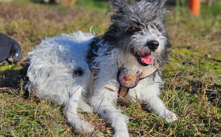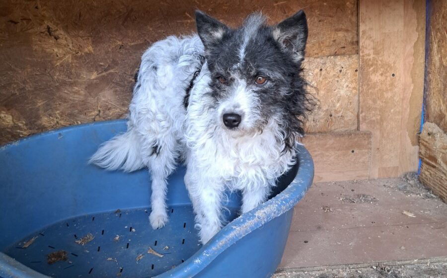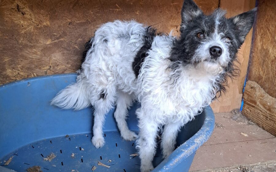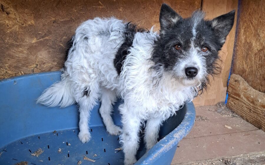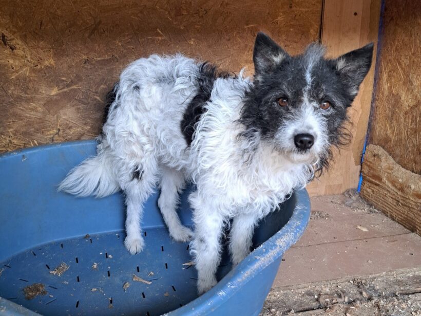 Mit etwa 5 Jahren ist Gipsy eine mittelgroße Hündin mit einer Schulterhöhe von etwa 40 cm. Ihr weißes, wuscheliges Fell ist von schwarzen Akzenten durchzogen – eine wilde, aber gleichzeitig kuschelige Erscheinung. Ihr freundliches Gesicht, geprägt von warmen braunen Augen und einer schwarzen Nase, die wie ein kleiner Lederknopf in ihrem Gesicht sitzt, strahlt eine besondere Sanftheit aus. Sie wirkt auf den ersten Blick wild, doch wer genau hinsieht, erkennt die zarte, verletzliche Seite dieser besonderen Hündin.