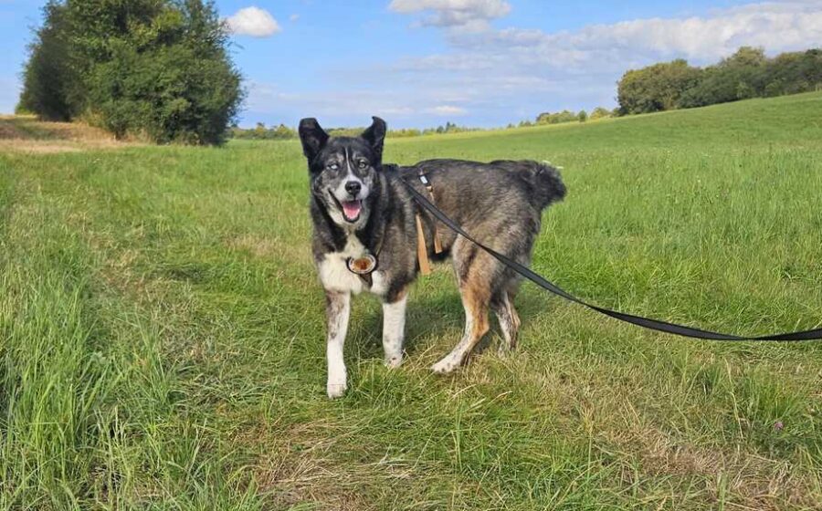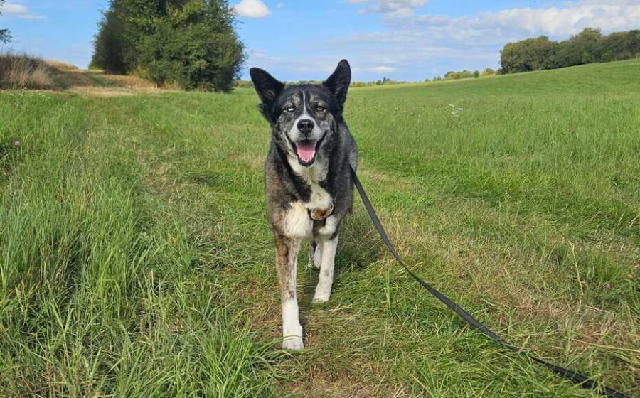 An der Leine läuft Gloria schon richtig schön und macht alles toll mit. Neue Gebäude oder fremde Häuser findet sie manchmal noch etwas gruselig – doch sie lässt sich immer besser überzeugen und vertraut ihren Menschen mehr und mehr. Auch ein paar Stunden alleine bleiben meistert sie problemlos.