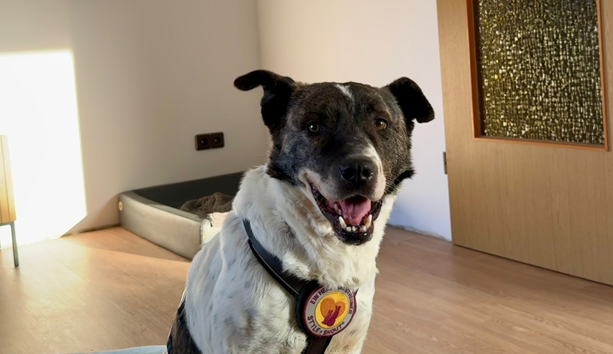 Goethe ist etwa zwei Jahre alt, mittelgroß und hat eine Schulterhöhe von rund 55 cm. Sein überwiegend weißes Fell ist von dunklen Akzenten durchzogen, die sein elegantes Erscheinungsbild unterstreichen. Seine lackschwarze Nase und die freundlichen braunen Augen erzählen von Sanftmut und Hoffnung. Er ist schlank, sportlich und einfach wunderschön – ein Rüde, der nicht nur äußerlich, sondern auch mit seinem Wesen bezaubert. Charakterlich zeigt sich Goethe sehr freundlich, offen und gutmütig. Mit Hündinnen versteht er sich gut, bei Rüden können wir dies derzeit noch nicht sicher sagen, da entsprechende Tests noch ausstehen.