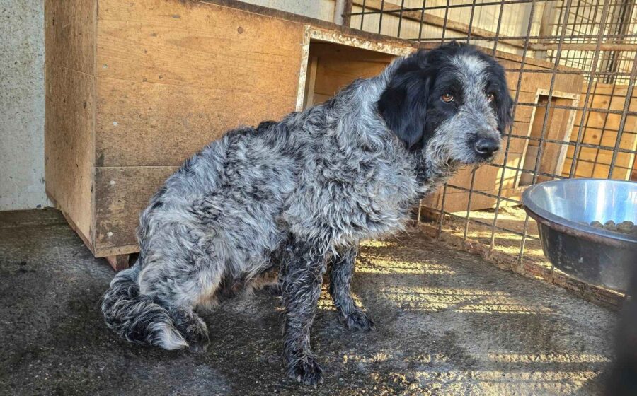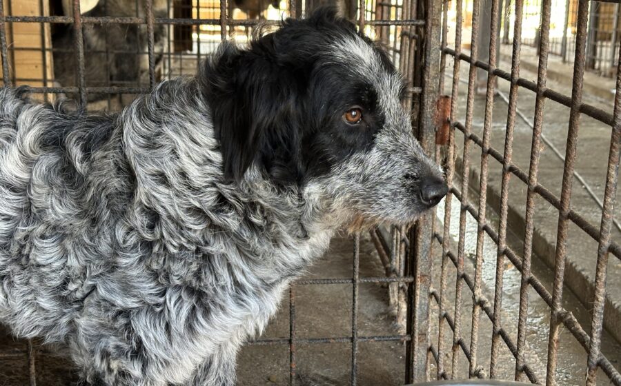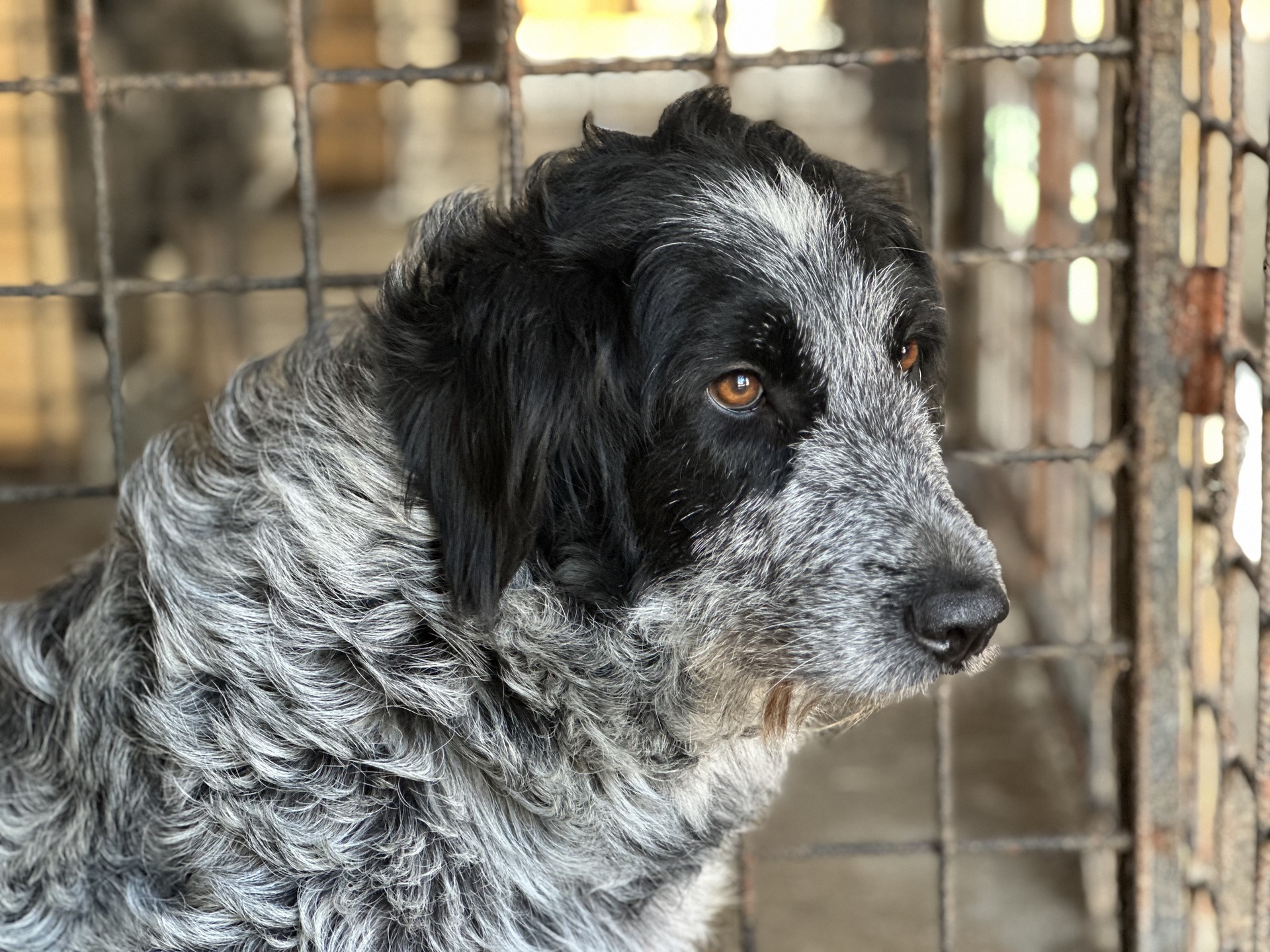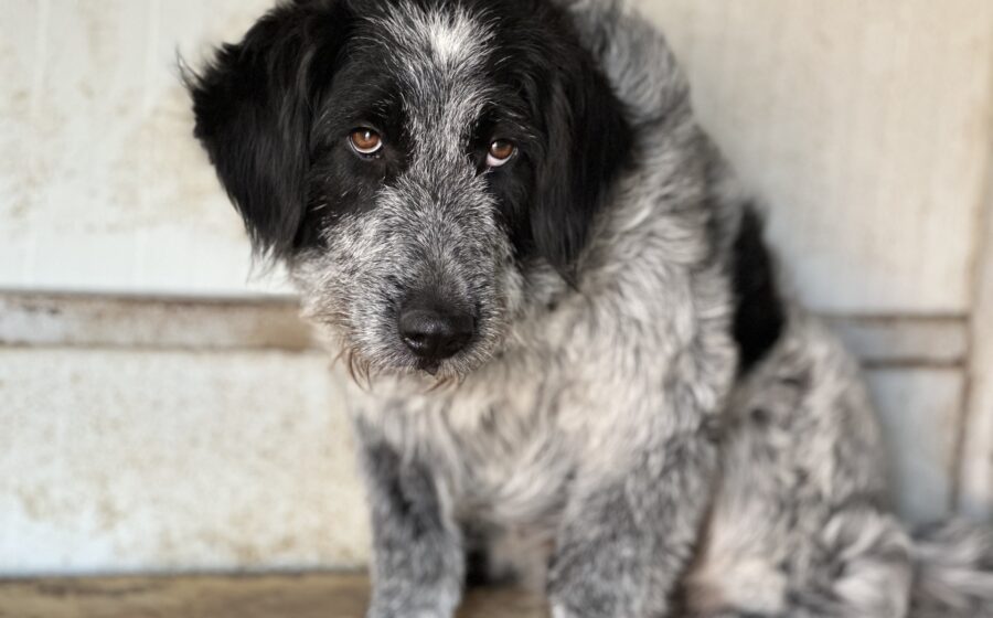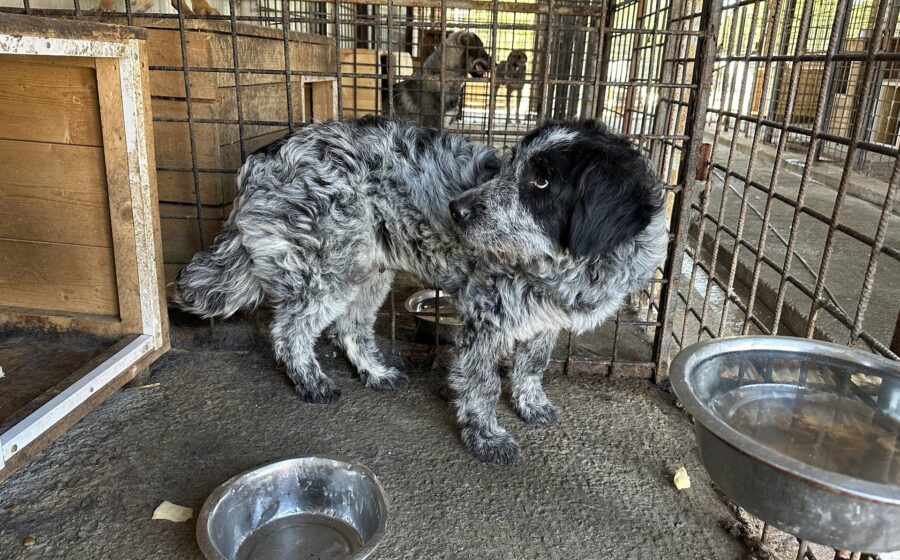 Unsere hübsche Maus mit dem schwarz-grau-weiß gelockten Fell, schaut noch skeptisch in die Kamera. Die Scheu vor Menschen ist aktuell noch groß – zu tief sitzen die Erfahrungen aus ihrer Vergangenheit. Sie wurde von Hundefängern eingefangen und in das öffentliche Shelter in Bistrița gebracht. Die meiste Zeit sitzt sie noch vorsichtig in einer Ecke der Hütte und beobachtet uns Menschen mit gesundem Respekt. Sie kommt nur sehr selten selbstständig aus ihrer Hütte heraus. Sie lässt sich aktuell noch nicht anfassen, zeigt aber auch keine Art von Aggression – knurrt oder bellt auch nicht. Sie schaut sogar teilweise eher neugierig. Als wir sie im April besucht haben, hatten wir das Gefühl, dass sie eher vom Shelterlärm und den Bedingungen vor Ort sehr eingeschüchter ist. Sie war durchaus offen für Leckerlies und zeigte sich neugierig, wenn wir in ihrem Kennel waren.