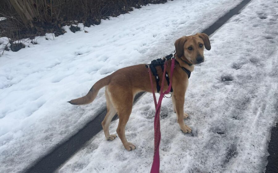 Die junge Hündin freut sich sehr über Spaziergänge und läuft wirklich toll und entspannt an der Leine, manchmal ein bisschen tollpatschig, aber das ist ihren überdimensional großen Pfoten geschuldet. Schnell hat sie schon einige Grundkommandos gelernt, ist sehr anpassungsfähig und orientiert sich gut an den Bezugspersonen und am Ersthund. Bei fremden Menschen verhält sich Hanni zwar anfangs vorsichtig, taut aber dann relativ schnell auf. Beim Tierarzt ist sie sehr aufmerksam und macht alles prima mit. Sie ist home-office-tauglich, auch Staubsauger, Kaffemaschine und andere Umweltreize wie Autos, Fahrräder, Roller sind schon nach kurzer Zeit auch kein Thema mehr. Auch das Autofahren klappt gut.