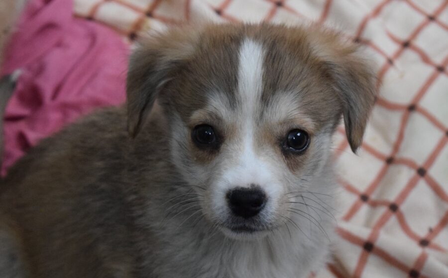 Jaro ist ein kleiner, kompakter Welpe mit weichem, plüschigem Fell in warmen Beige- und Brauntönen. Besonders auffällig ist seine weiße Zeichnung im Gesicht, die sich von der Stirn bis zur Schnauze zieht und ihm einen sehr liebenswerten, fast nachdenklichen Ausdruck verleiht. Seine dunklen, großen Augen wirken aufmerksam und freundlich. Die Schlappohren und die zarte Statur unterstreichen seinen jungen, welpentypischen Charme.