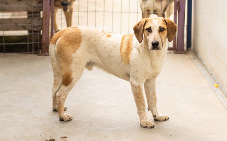 Josha ist mittlerweile etwa ein Jahr alt, hat eine Schulterhöhe von ca. 55 cm erreicht und gehört damit zu den mittelgroßen Hunden. Optisch beeindruckt er mit seinem kurzhaarigen, braun-weißen Fell, einer markanten Gesichtszeichnung und sanften, dunklen Augen, die tief blicken lassen.