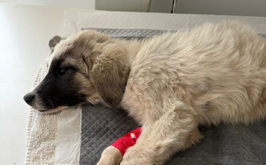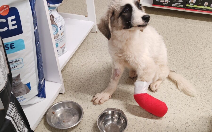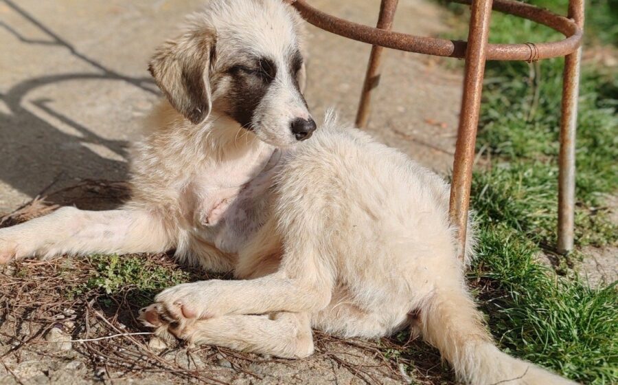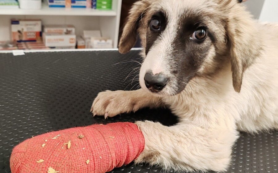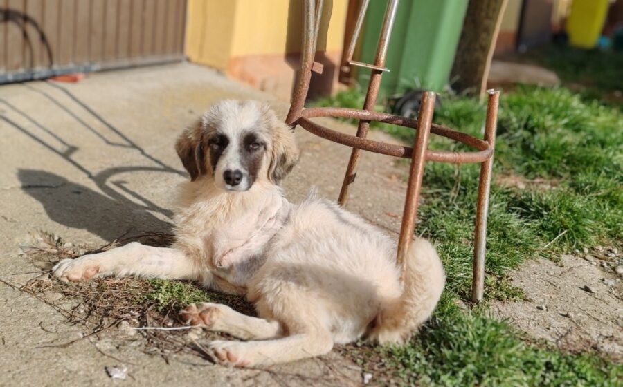 Kathy, ein Hundekind, das mehr Mut in sich trägt als viele erwachsene Hunde. Sie wurde völlig allein auf einem Feld zwischen zwei Dörfern gefunden – ausgehungert, voller Flöhe, geschwächt und mit einem Vorderbein, das so schwer verletzt war, dass die Zehen regelrecht zerquetscht waren. Ein Monat lang kämpften die Tierärzte darum, das Bein zu retten, doch die Verletzungen waren zu massiv. Schließlich musste es amputiert werden, um ihr Schmerzen zu ersparen.