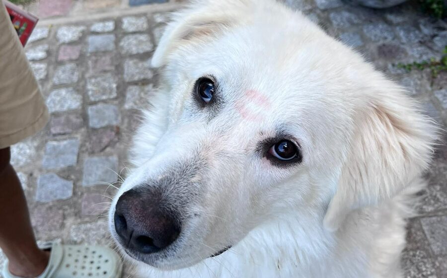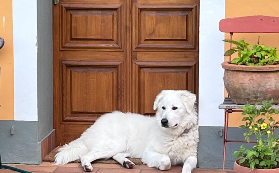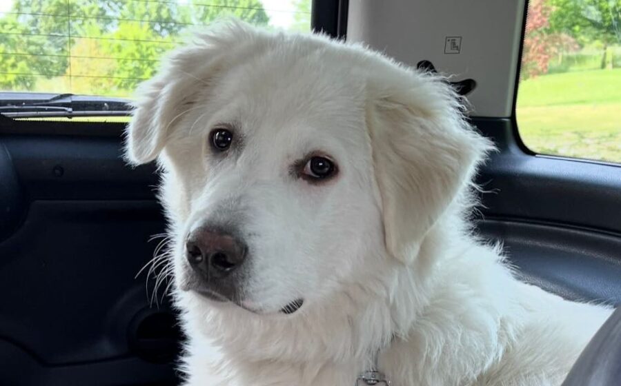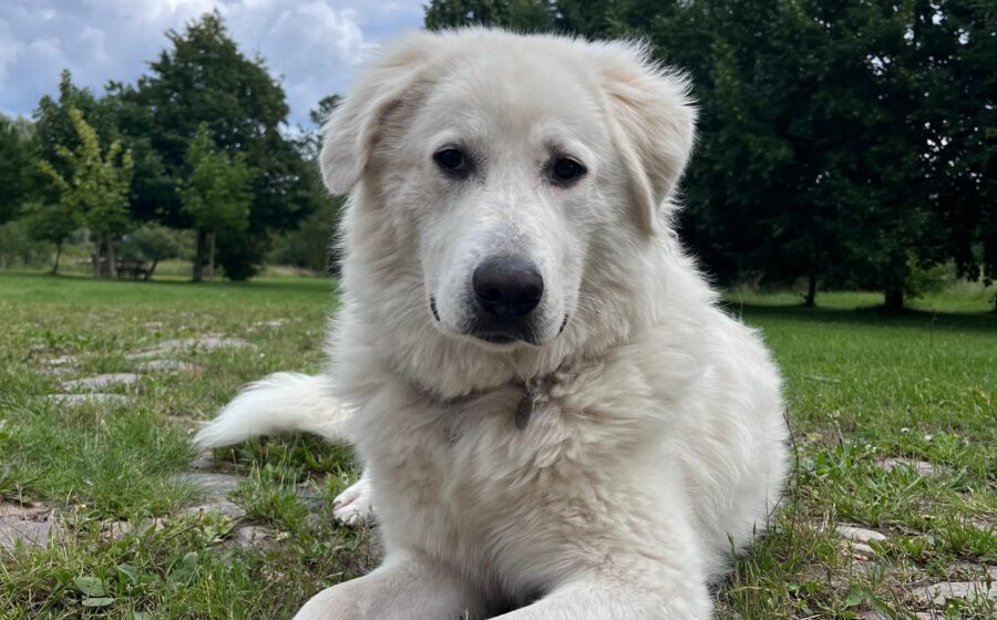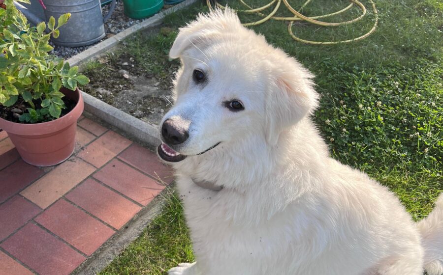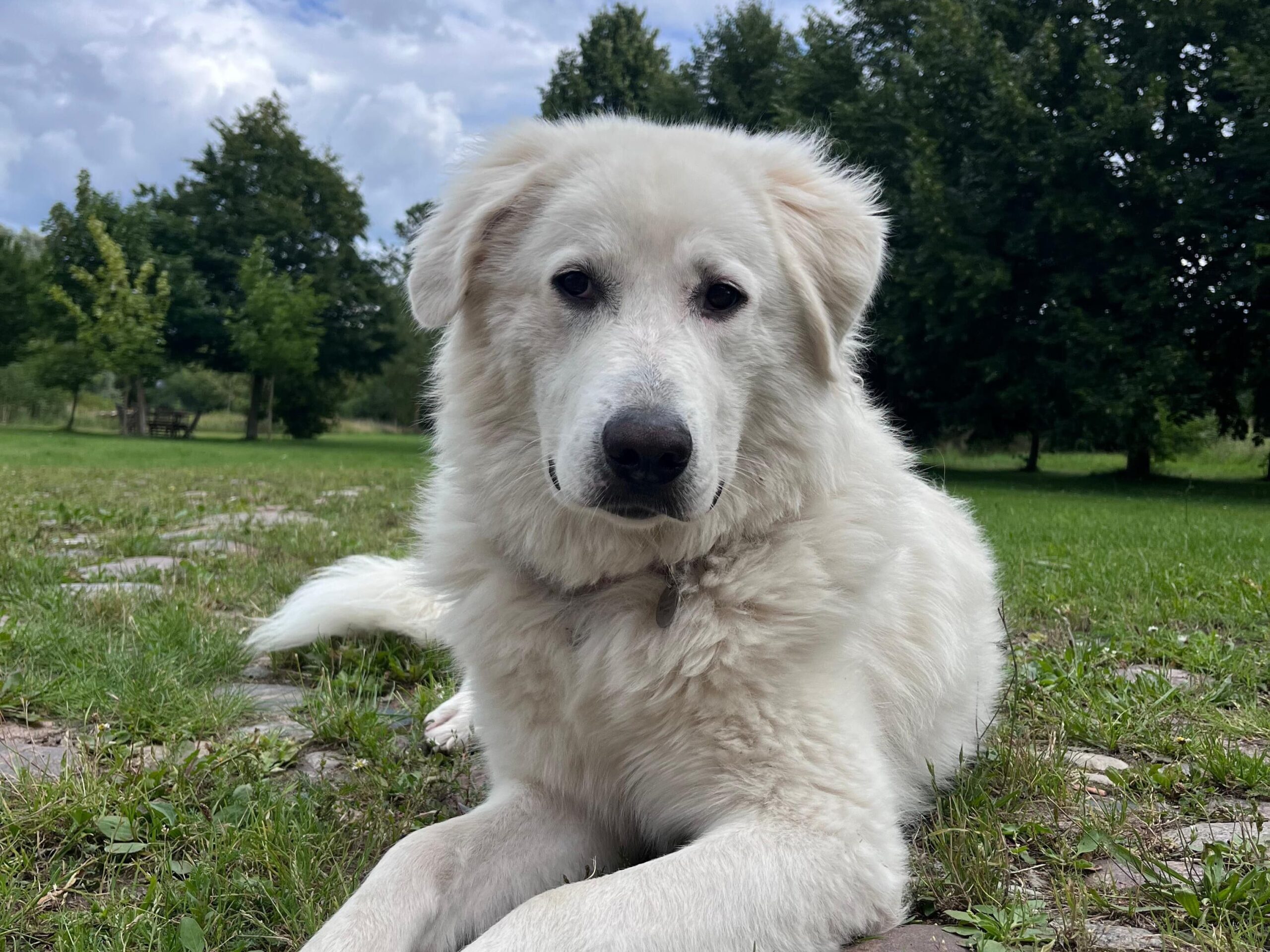 Unsere große Zuckerschnute Klara, eine aufgeweckte groß gewordene Mischlingshündin, in der ein Maremmen-Pyrenäen-Berghund steckt.