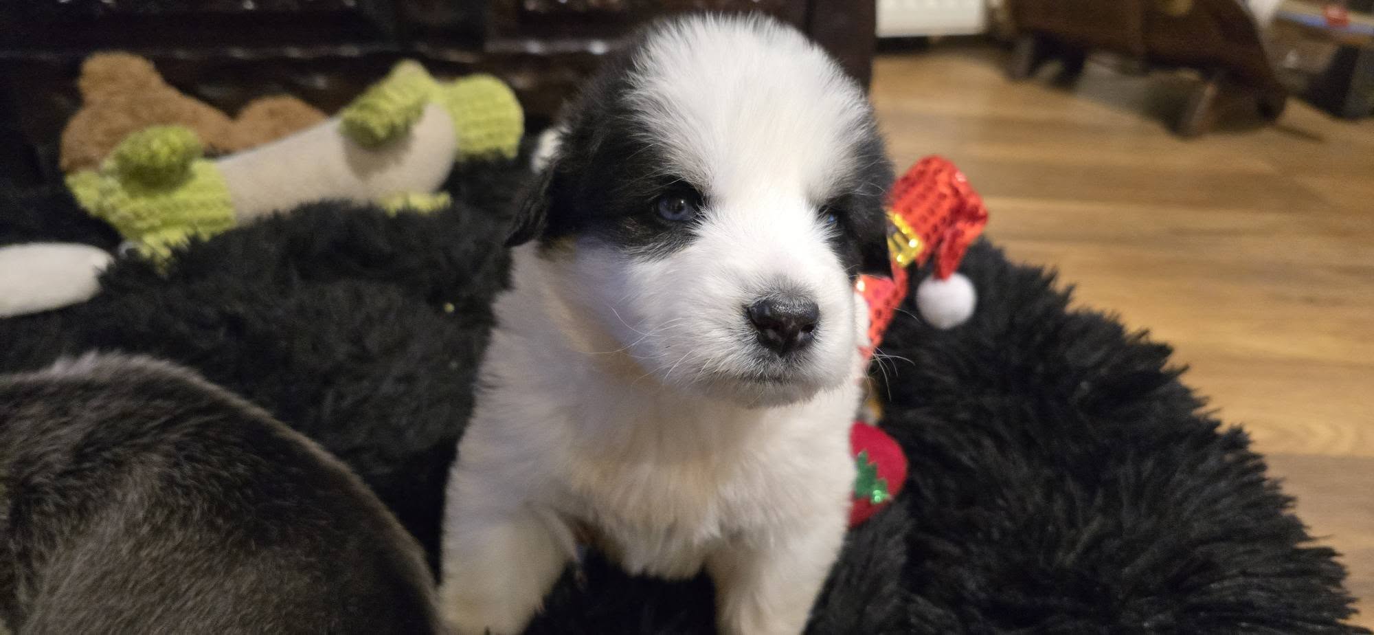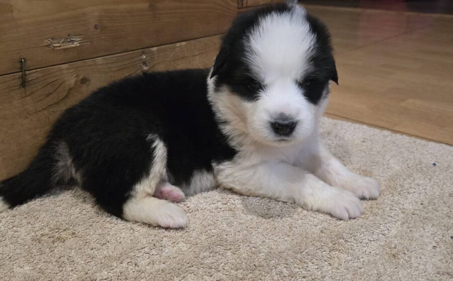 Lennarts dunkles Fell an Rücken, Kopfpartie und Rute bildet einen wunderschönen Kontrast zu seinem sonst schneeweißen Körper. Das i-Tüpfelchen sind jedoch seine außergewöhnlichen Augen – eines dunkel, das andere strahlend blau. Vermutlich ist er ein Husky-Mix und wird ausgewachsen wahrscheinlich eine mittlere Schulterhöhe erreichen.