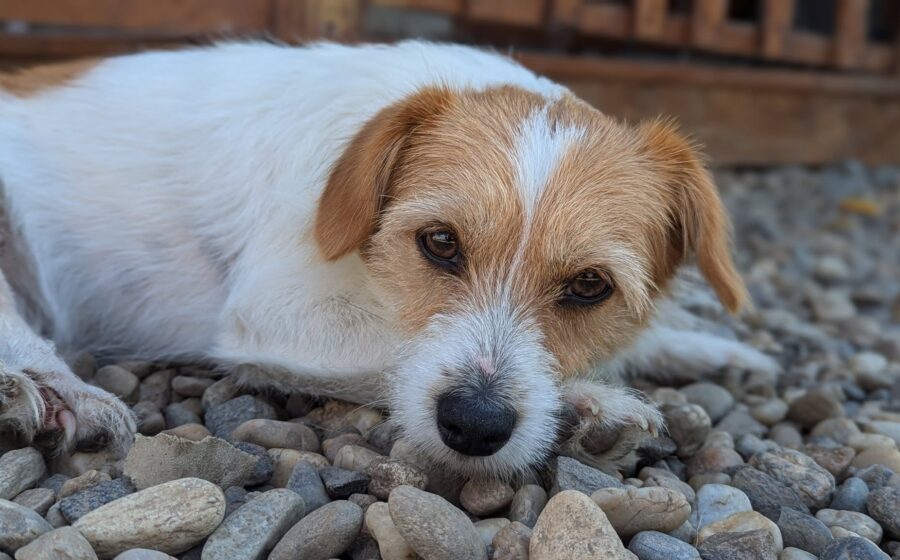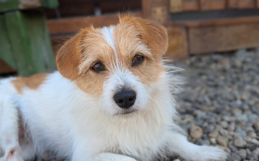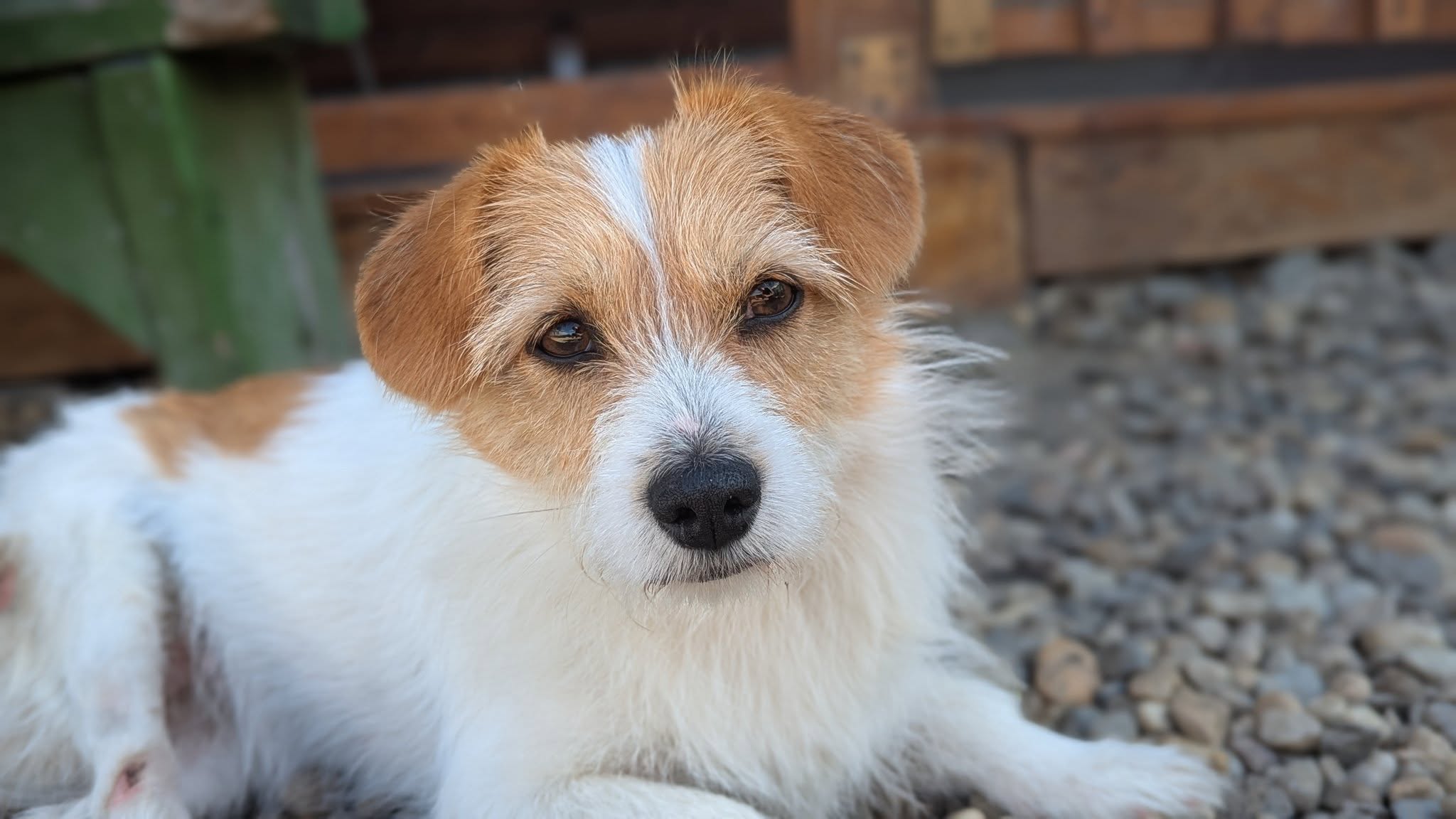 Lilly ist eine zierliche Hündin mit einer Schulterhöhe von etwa 35 cm und einem Gewicht von rund 10 kg – vermutlich wird sie auch ausgewachsen eine kleine Hündin bleiben. Ihr Fell ist überwiegend weiß, mit hellbraunen Akzenten, die vor allem ihr hübsches Köpfchen zieren. Ihre sanften braunen Augen und die lackschwarze Nase verleihen ihr einen Ausdruck, der mitten ins Herz trifft. Ein wunderschönes Gesicht, das man nicht mehr vergisst.