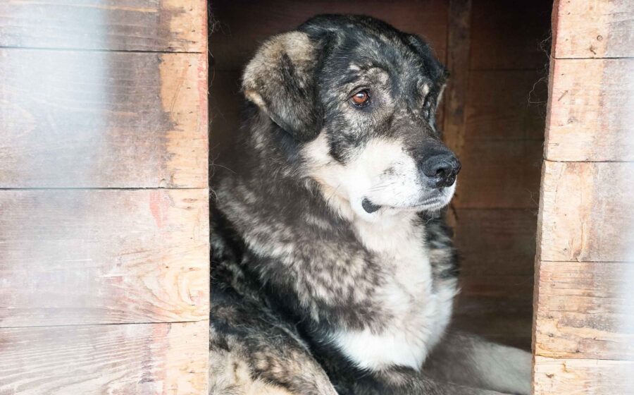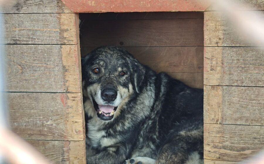 Lukas ist etwa 13 Jahre alt, ein großer Rüde mit rund 60–65 cm Schulterhöhe. Sein schwarzes und braunes Fell ist grau geworden, und in seinen warmen, dunklen Augen liegt eine stille Traurigkeit. Vielleicht trägt er Gene eines Herdenschutzhundes in sich – ruhig, wachsam, eigenständig.