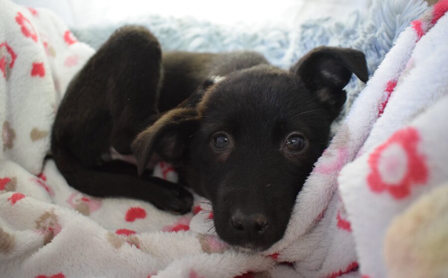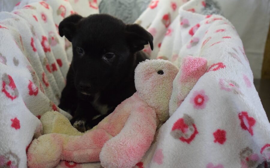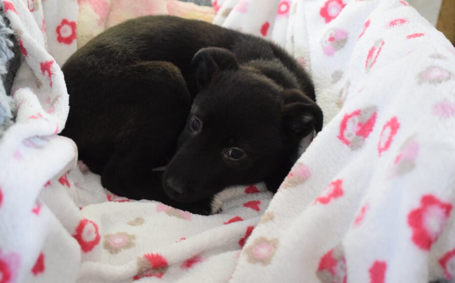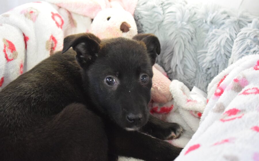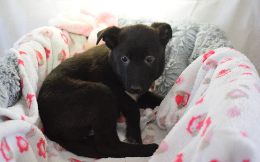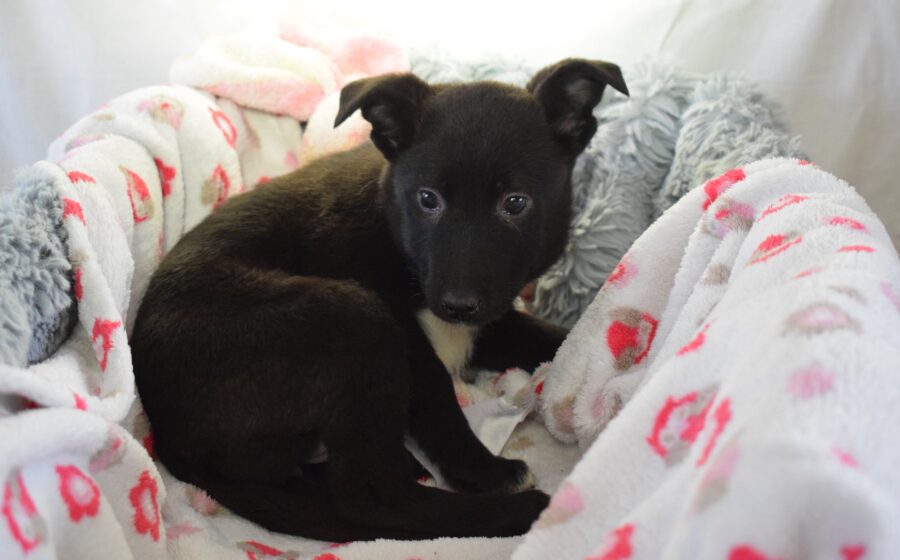 Momentan ist sie rund 25 Zentimeter groß und wiegt etwa 2 bis 3 Kilogramm. Ihr Fell ist überwiegend schwarz, durchbrochen von einem feinen weißen Fleck an der Brust, und ihre dunklen, sanften Augen verleihen ihr einen besonders warmherzigen Ausdruck. Mit ihren kleinen Knickohren wirkt sie gleichzeitig neugierig und verspielt, genau wie es sich für ein junges Hundemädchen gehört.