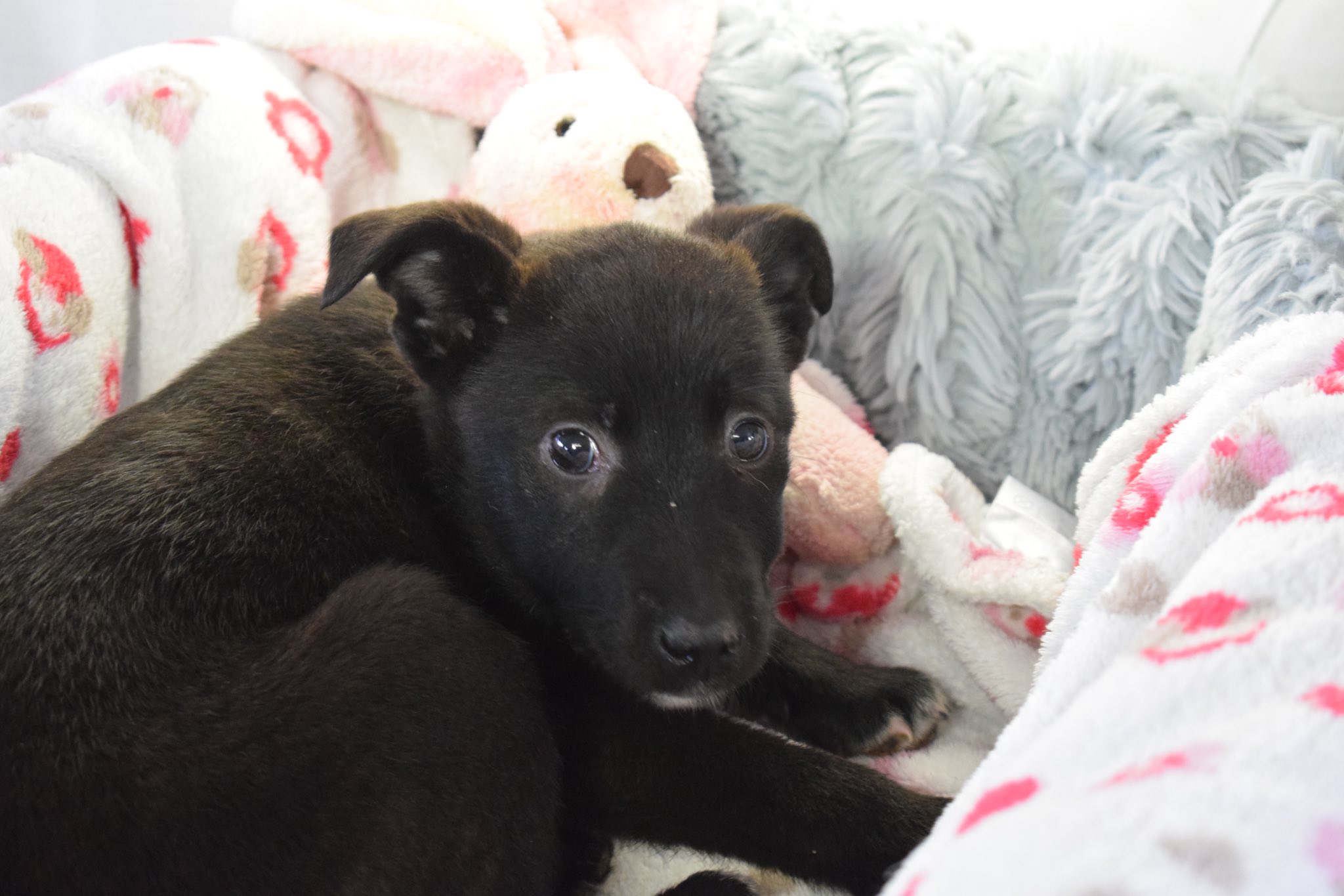 Momentan ist sie rund 25 Zentimeter groß und wiegt etwa 2 bis 3 Kilogramm. Ihr Fell ist überwiegend schwarz, durchbrochen von einem feinen weißen Fleck an der Brust, und ihre dunklen, sanften Augen verleihen ihr einen besonders warmherzigen Ausdruck. Mit ihren kleinen Knickohren wirkt sie gleichzeitig neugierig und verspielt, genau wie es sich für ein junges Hundemädchen gehört.