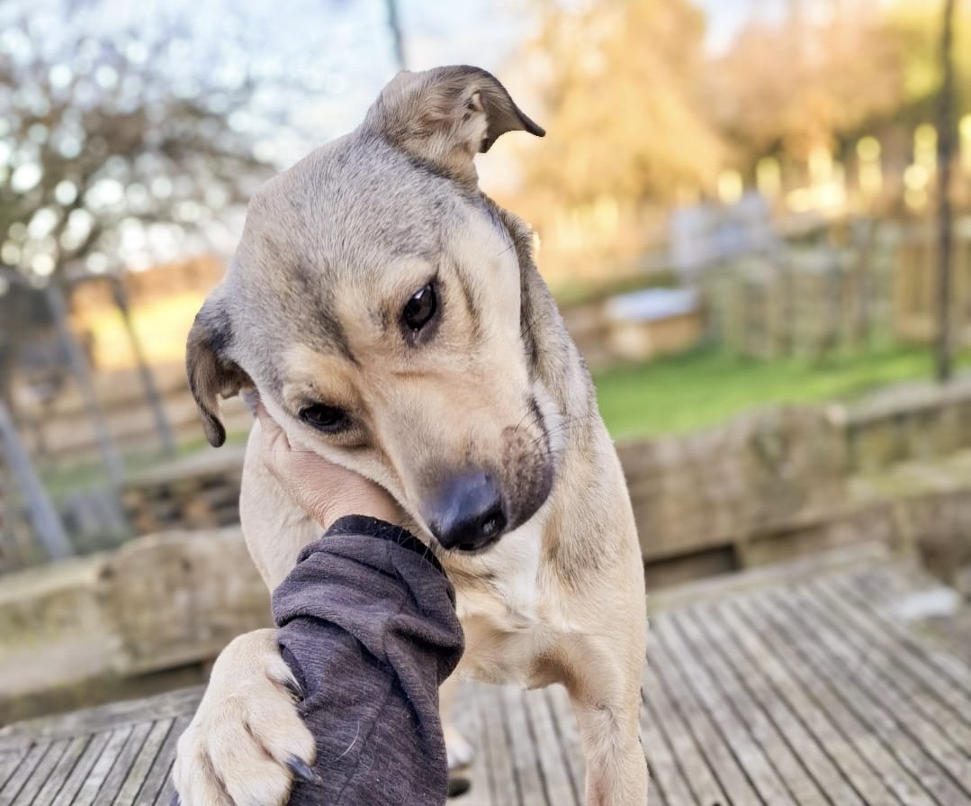 Mit anderen Rüden tut sich Milo schwer. Doch auch hier wird intensiv trainiert: das Abbruchsignal sitzt inzwischen gut, und Milo toleriert männliche Artgenossen zunehmend besser. Mit Hündinnen hingegen ist er absolut verträglich und freundlich. Milo ist etwa 2,5 Jahre alt und hat eine mittlere, angenehme Größe. Er hatte in der Vergangenheit einen positiven Kontakt mit Katzen – das könnte also durchaus möglich sein.