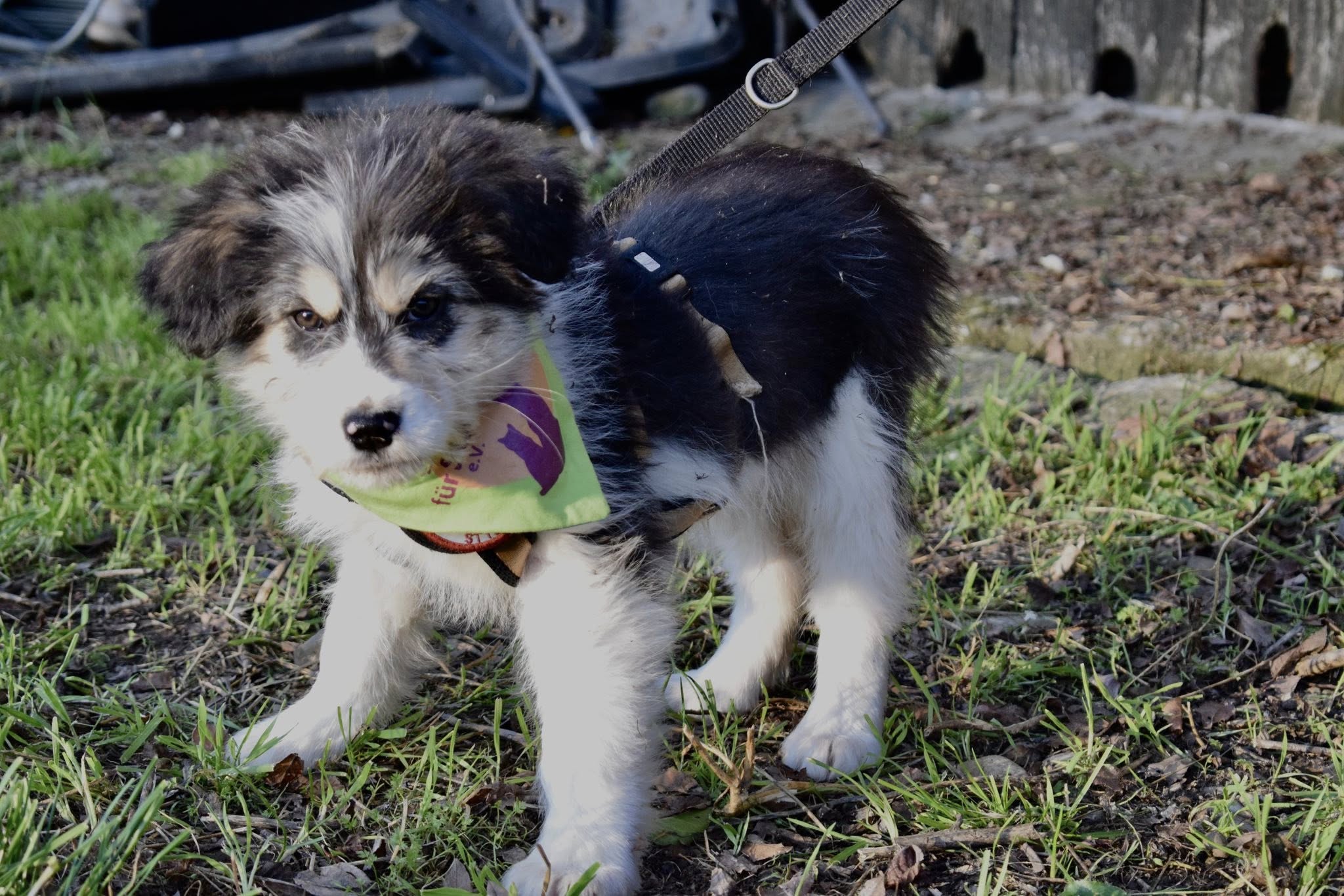 Monja ist eine etwa 2,5 bis 3 Monate alte Hündin, die mit ihrem süßen, welpentypisch verspielten Wesen sofort berührt. Sie liebt die Nähe zu Menschen, sucht freundlich den Kontakt und zeigt sich dabei voller Neugier. Ihr Fell ist wuschelig, weich und wunderschön gezeichnet – Beige, Schwarz und Weiß ergeben eine harmonische Mischung, die sie sofort ins Herz fallen lässt. Mit anderen Hunden zeigt sie sich bisher verträglich. Ausgewachsen wird sie voraussichtlich mittelgroß bis groß sein.