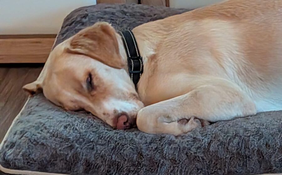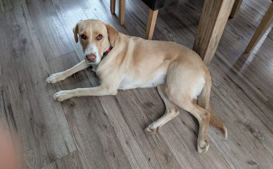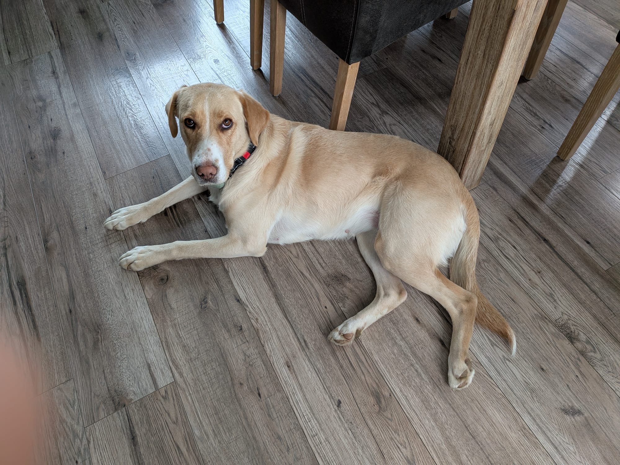Nele ist gut 2 Jahre alt und befindet sich damit in einem angenehmen, ausgeglichenen Alter. Mit einer Schulterhöhe von rund 55 cm und einem Gewicht von etwa 28 kg ist sie eine mittelgroße, sehr harmonisch gebaute Hündin. Ihr weiches creme-hellbraunes Fell, ihre Schlappohren und ihr freundlicher Blick verleihen ihr eine besonders warme Ausstrahlung. Optisch erinnert sie stark an einen Labrador Retriever, vermutlich handelt es sich jedoch um einen Labrador-Mischling.
