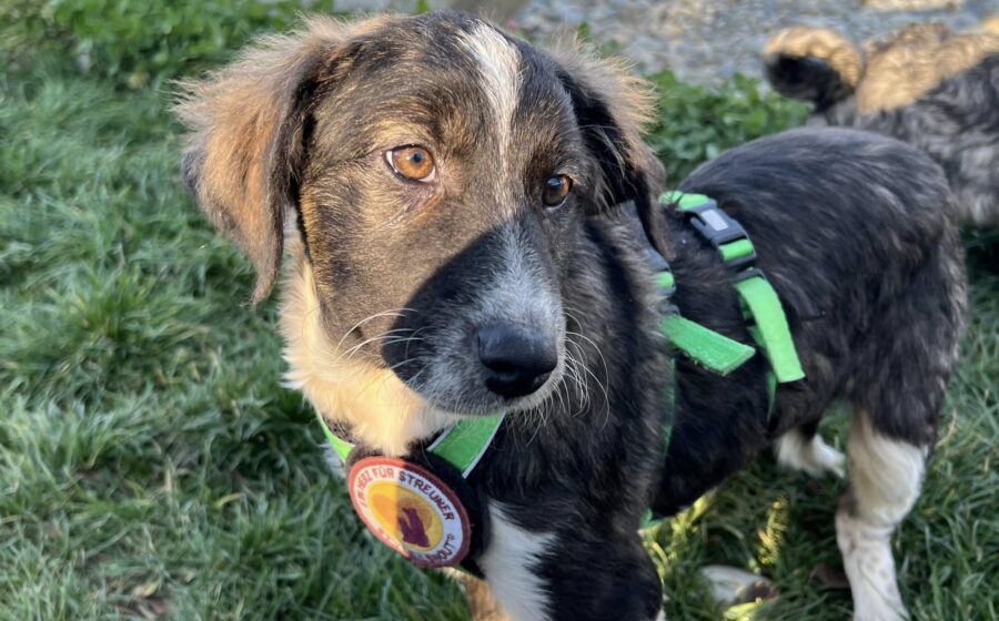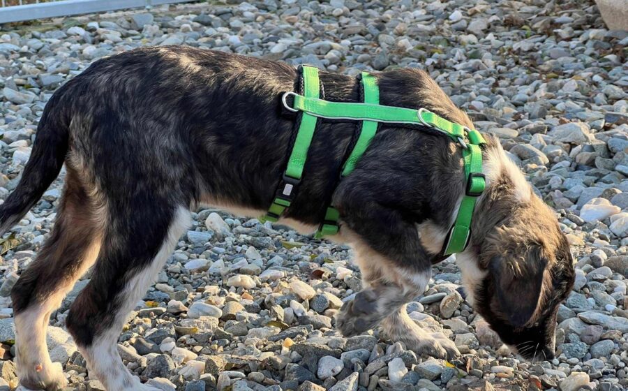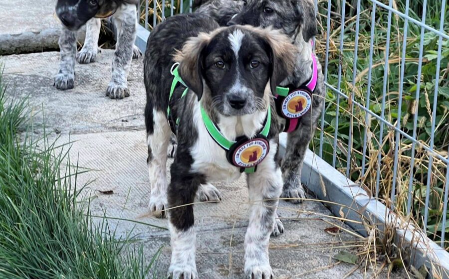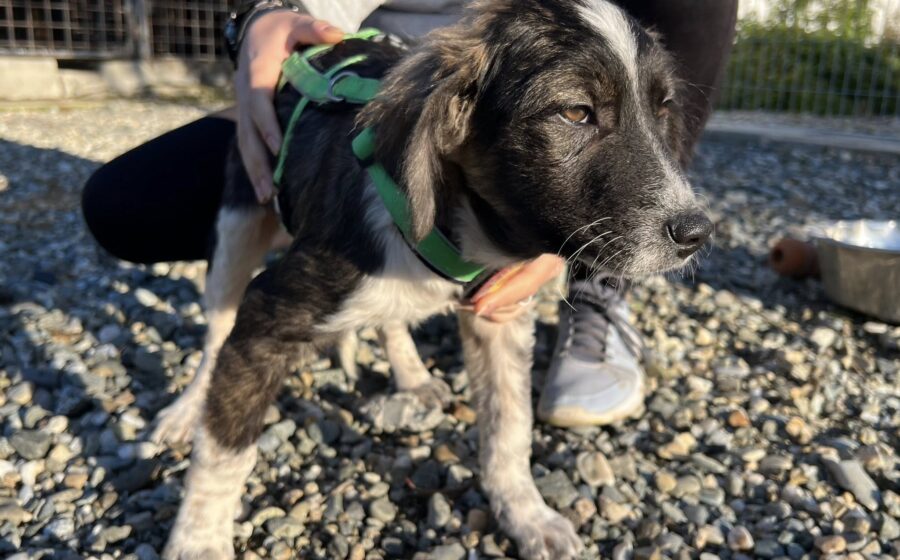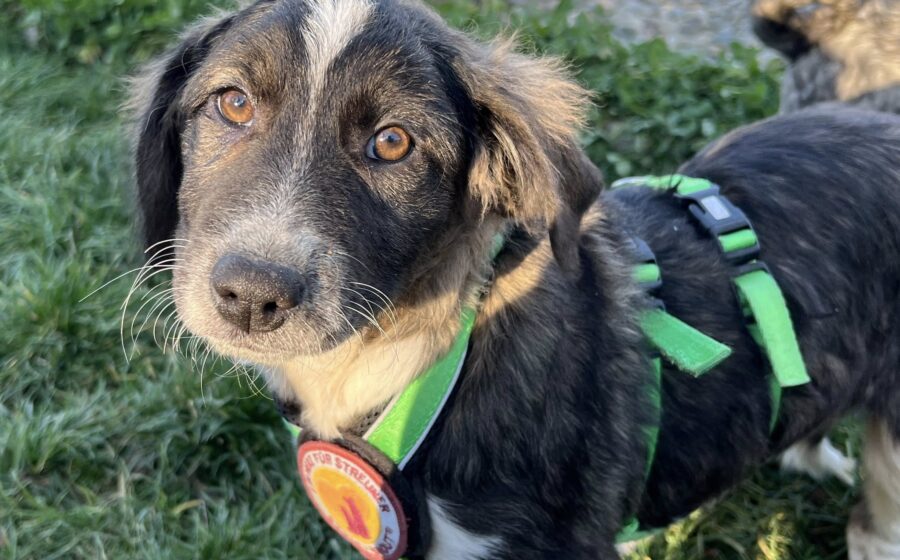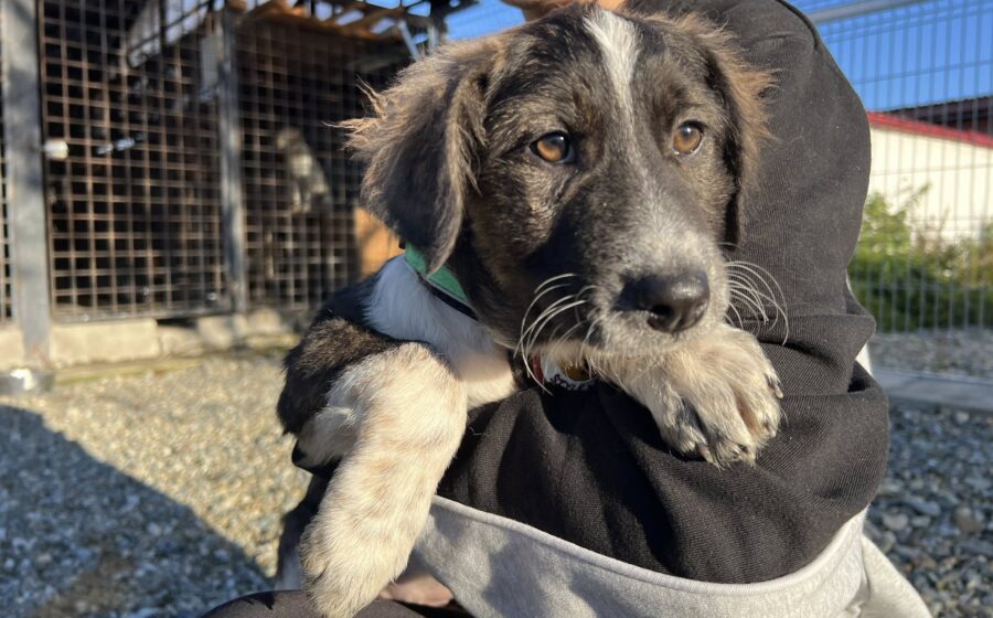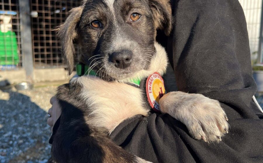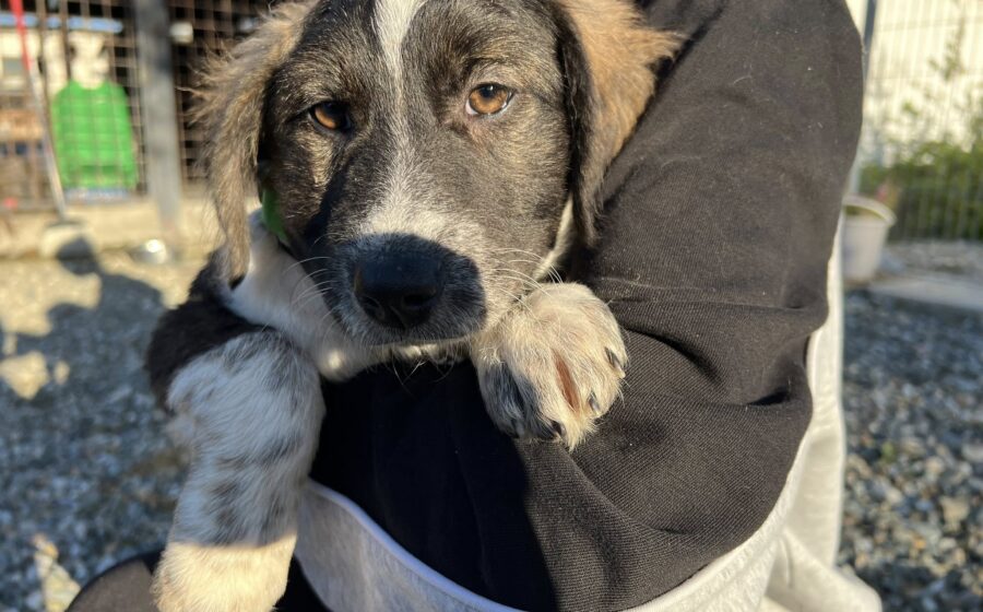 Nougi ist jetzt etwa 2,5 Monate jung, knapp 8–10 kg schwer und ein richtiges Sonnenscheinchen. Ihre wunderschönen bernsteinfarbenen Augen, die flauschigen Ohren und das schwarz-weiß gesprenkelte Fell machen sie zu einer richtigen Hingucker-Hündin. Sie wirkt auf den ersten Blick zart – aber in diesem Körper steckt ein mutiges, neugieriges und lebensfrohes Welpenmädchen, das endlich erfahren möchte, wie sich ein richtiges Zuhause anfühlt.