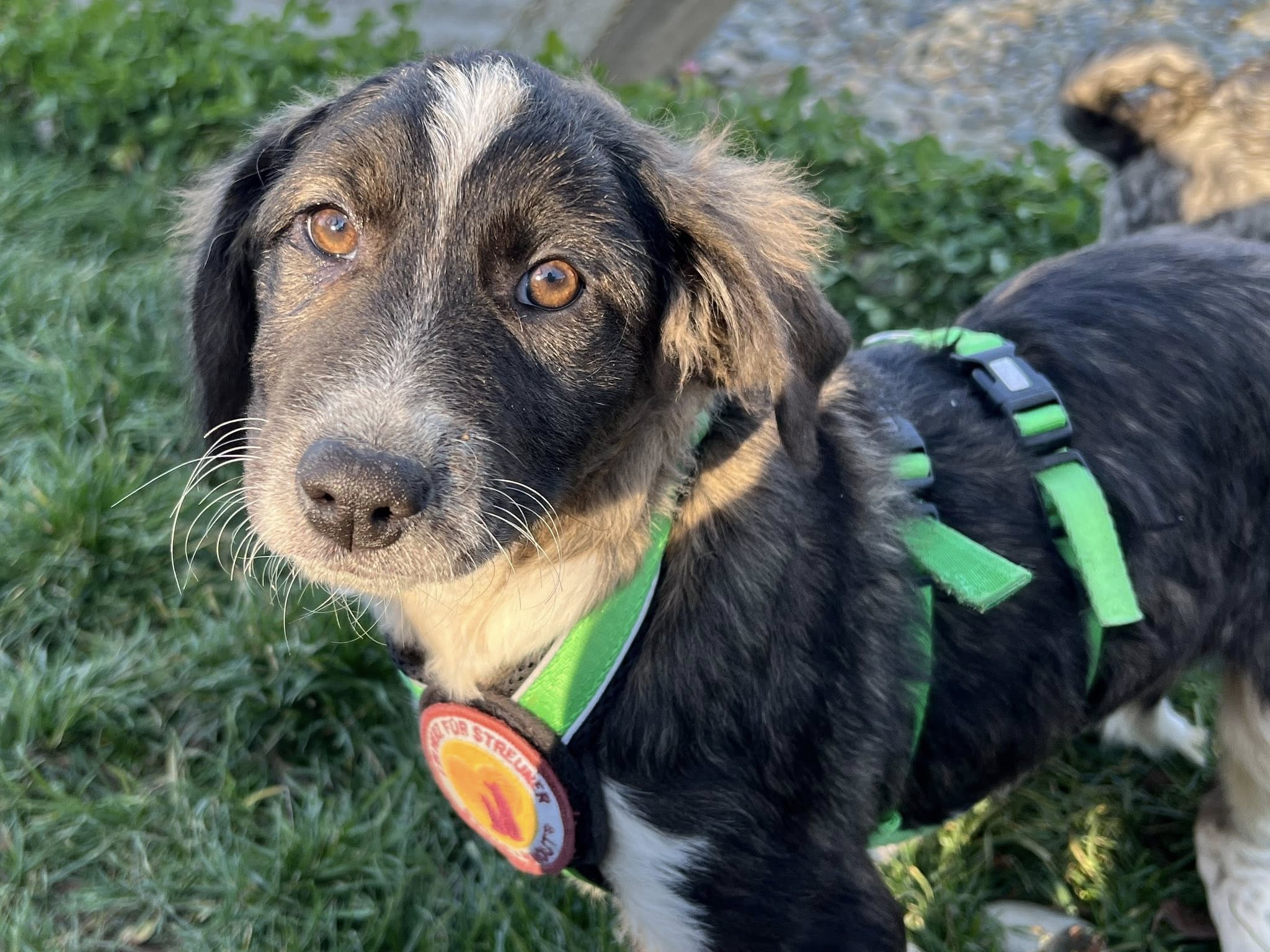 Nougi ist jetzt etwa 2,5 Monate jung, knapp 8–10 kg schwer und ein richtiges Sonnenscheinchen. Ihre wunderschönen bernsteinfarbenen Augen, die flauschigen Ohren und das schwarz-weiß gesprenkelte Fell machen sie zu einer richtigen Hingucker-Hündin. Sie wirkt auf den ersten Blick zart – aber in diesem Körper steckt ein mutiges, neugieriges und lebensfrohes Welpenmädchen, das endlich erfahren möchte, wie sich ein richtiges Zuhause anfühlt.