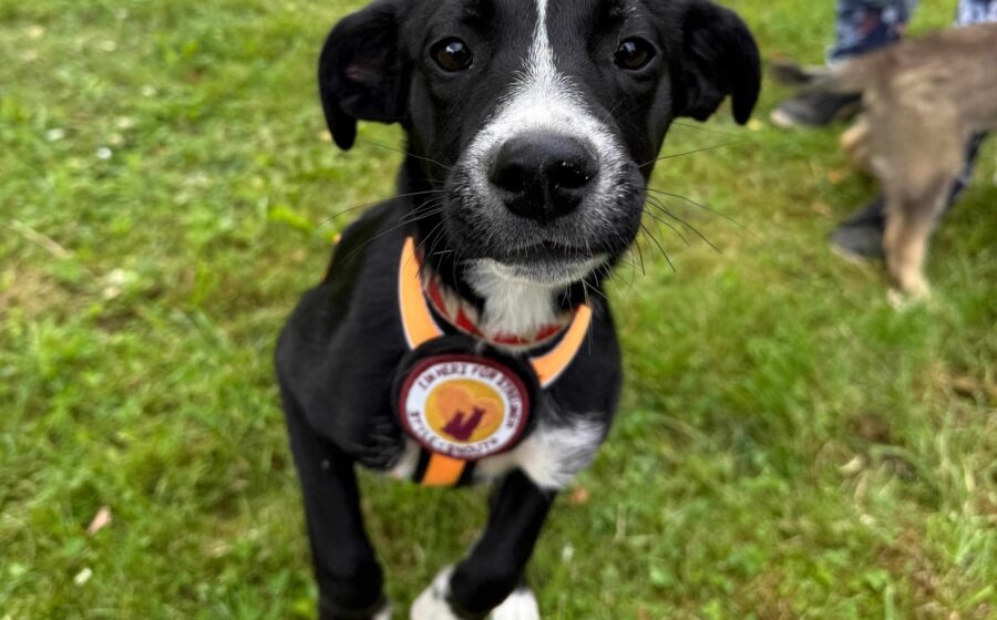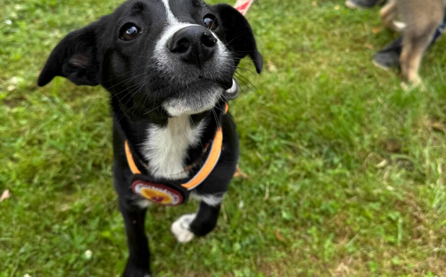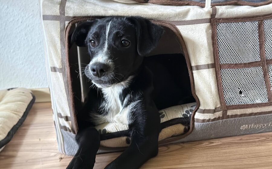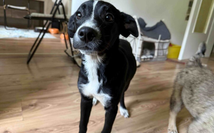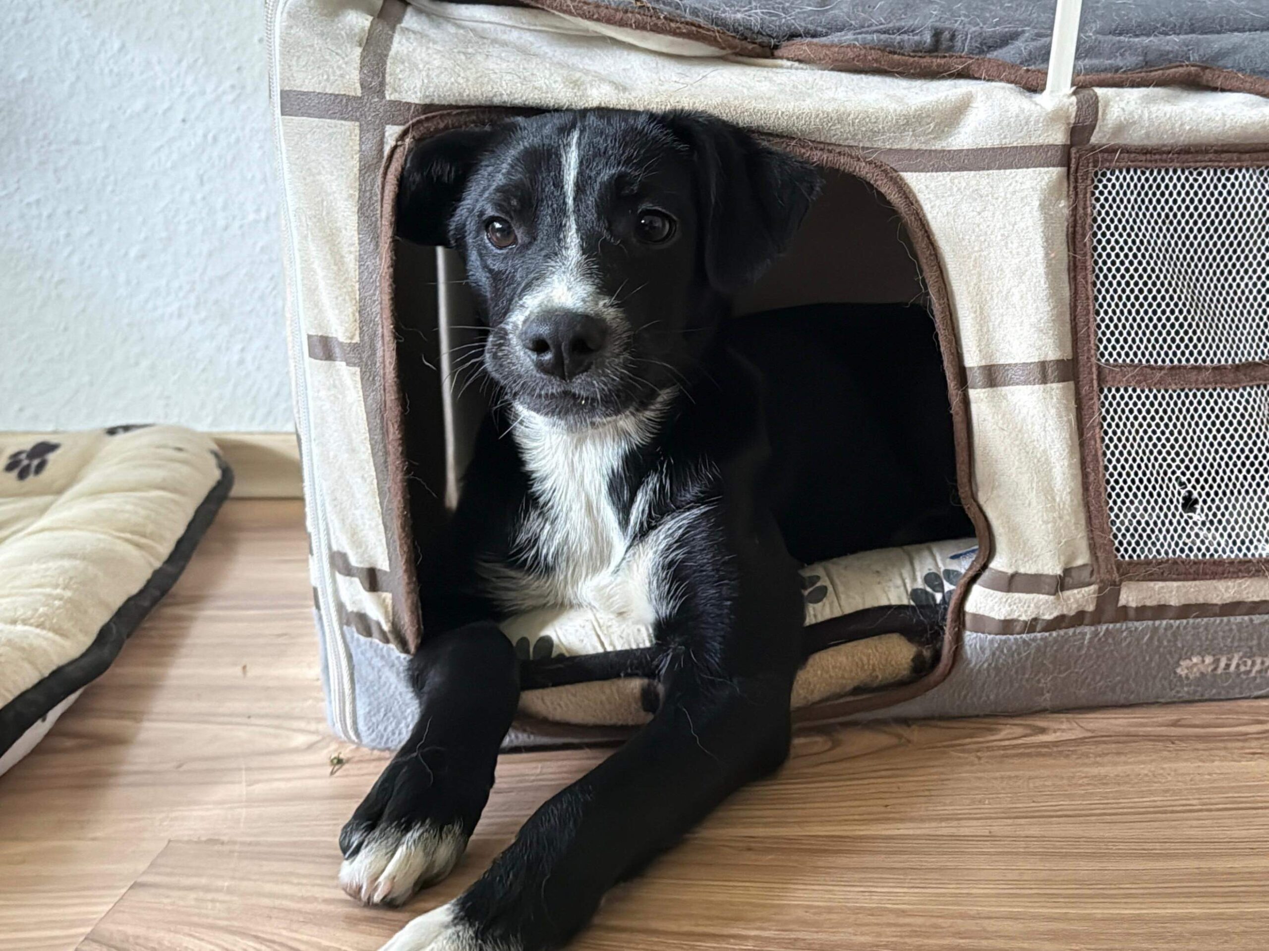 Die junge, schwarze Hundedame mit der weißen Brust- und Gesichtszeichnung reiste aus einer Pflegestelle in Cluj, Rumänien in ihre Pflegestelle nach Witten und hat dort die Herzen im Sturm erobert. Sie ist sensibel, freundlich, sehr verschmust und begegnet Menschen offen und zutraulich. Auch mit anderen Hunden versteht sie sich problemlos – eher so der Typ: „Peace, not drama“.